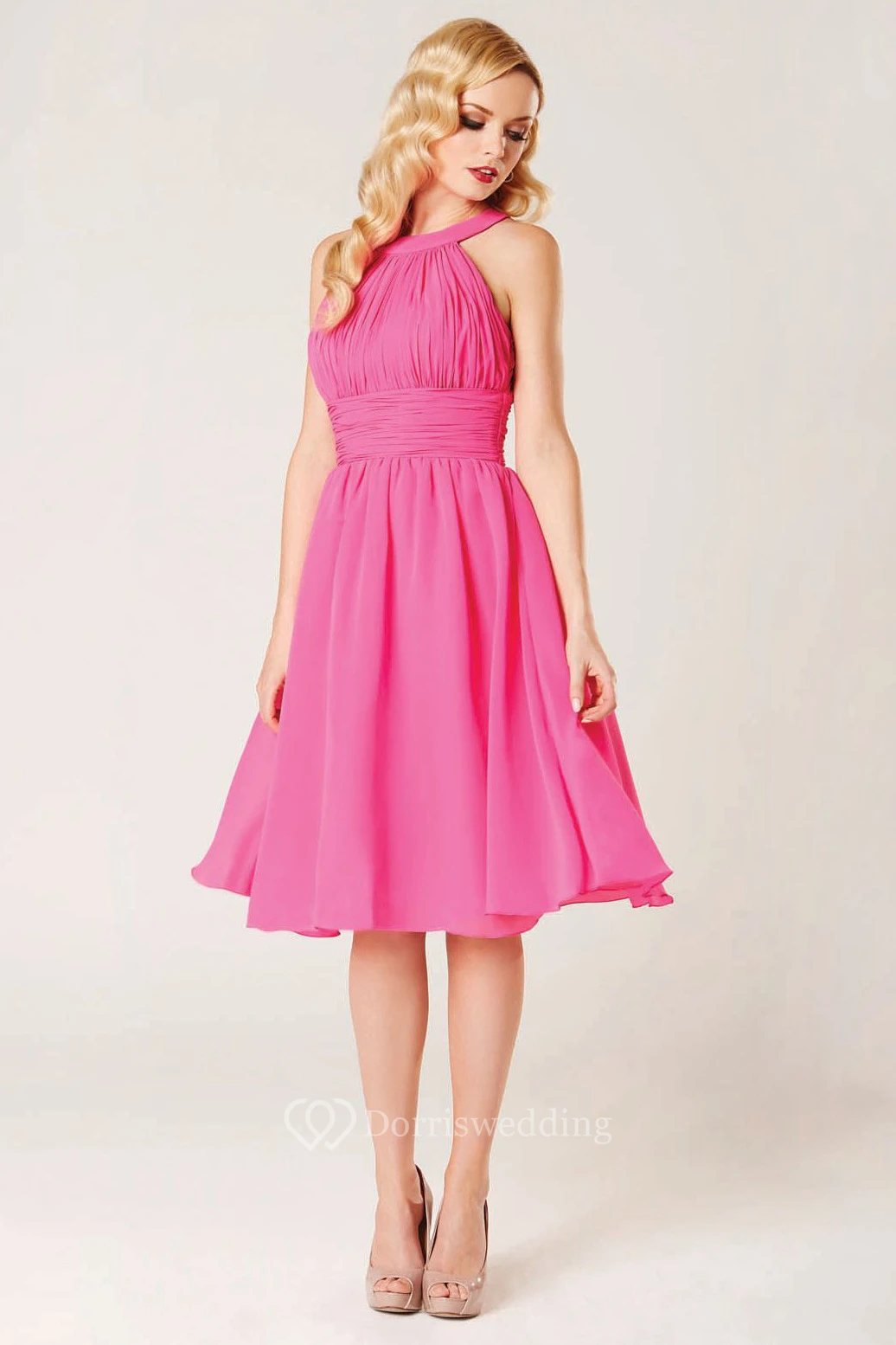 A-Line Sleeveless Scoop-Neck Ruched Midi Chiffon Bridesmaid Dress
