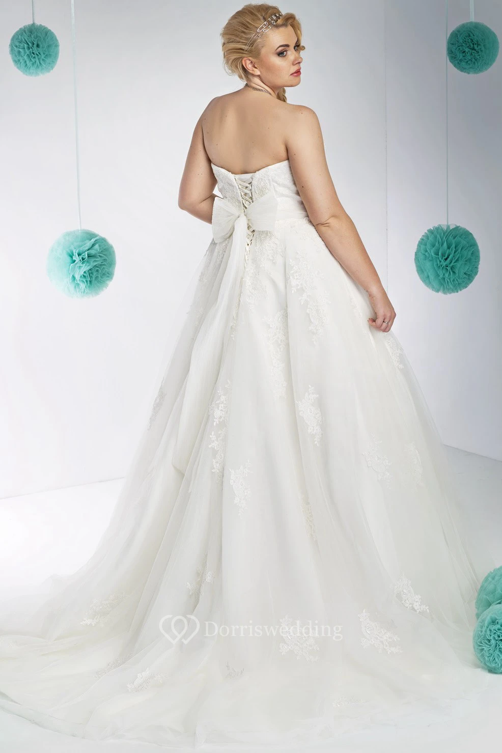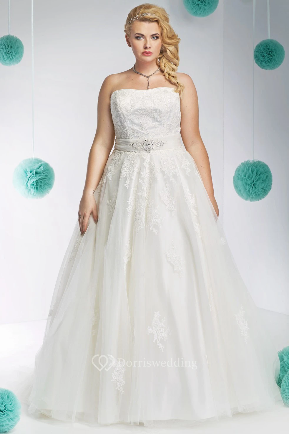 A-Line Sleeveless Strapless Appliqued Floor-Length Lace&Tulle Plus Size Wedding Dress With Waist Jewellery And Bow