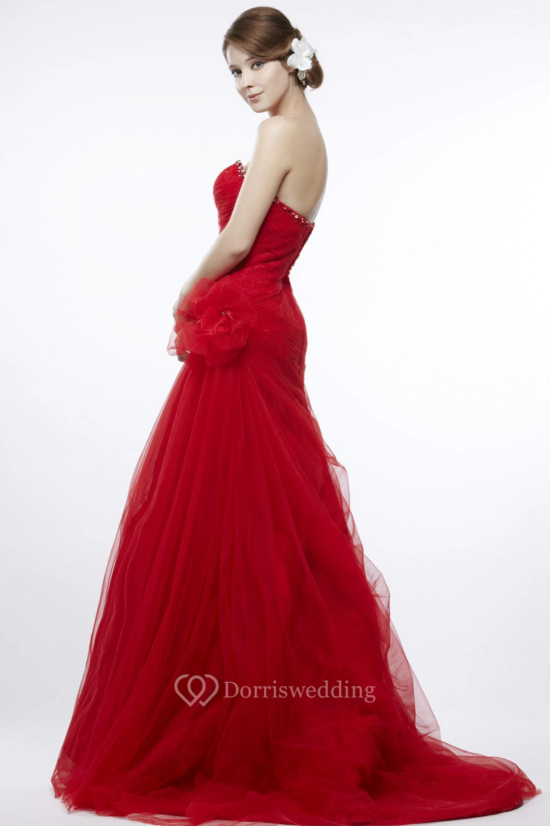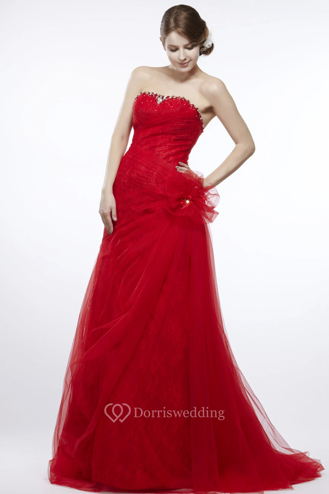 A-Line Sleeveless Strapless Beaded Floor-Length Tulle&Lace Prom Dress With Ruffles And Flower