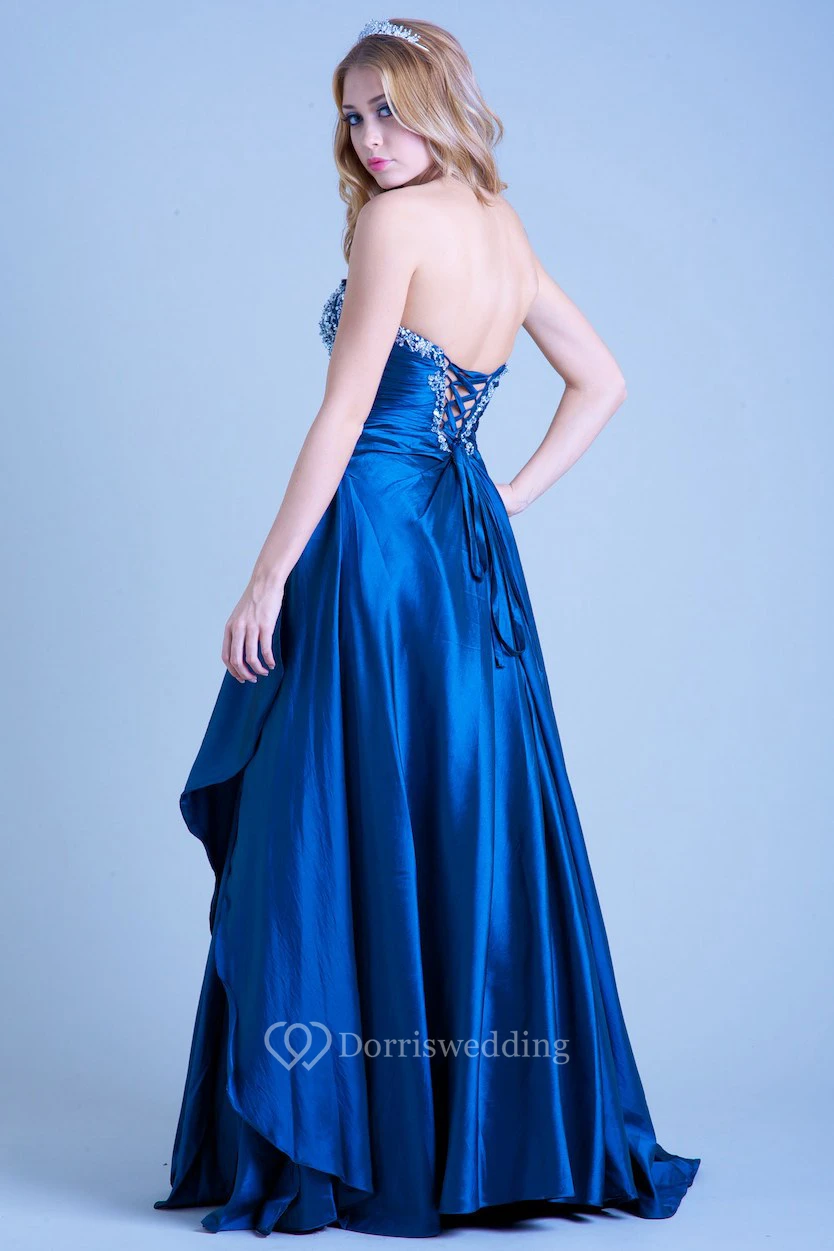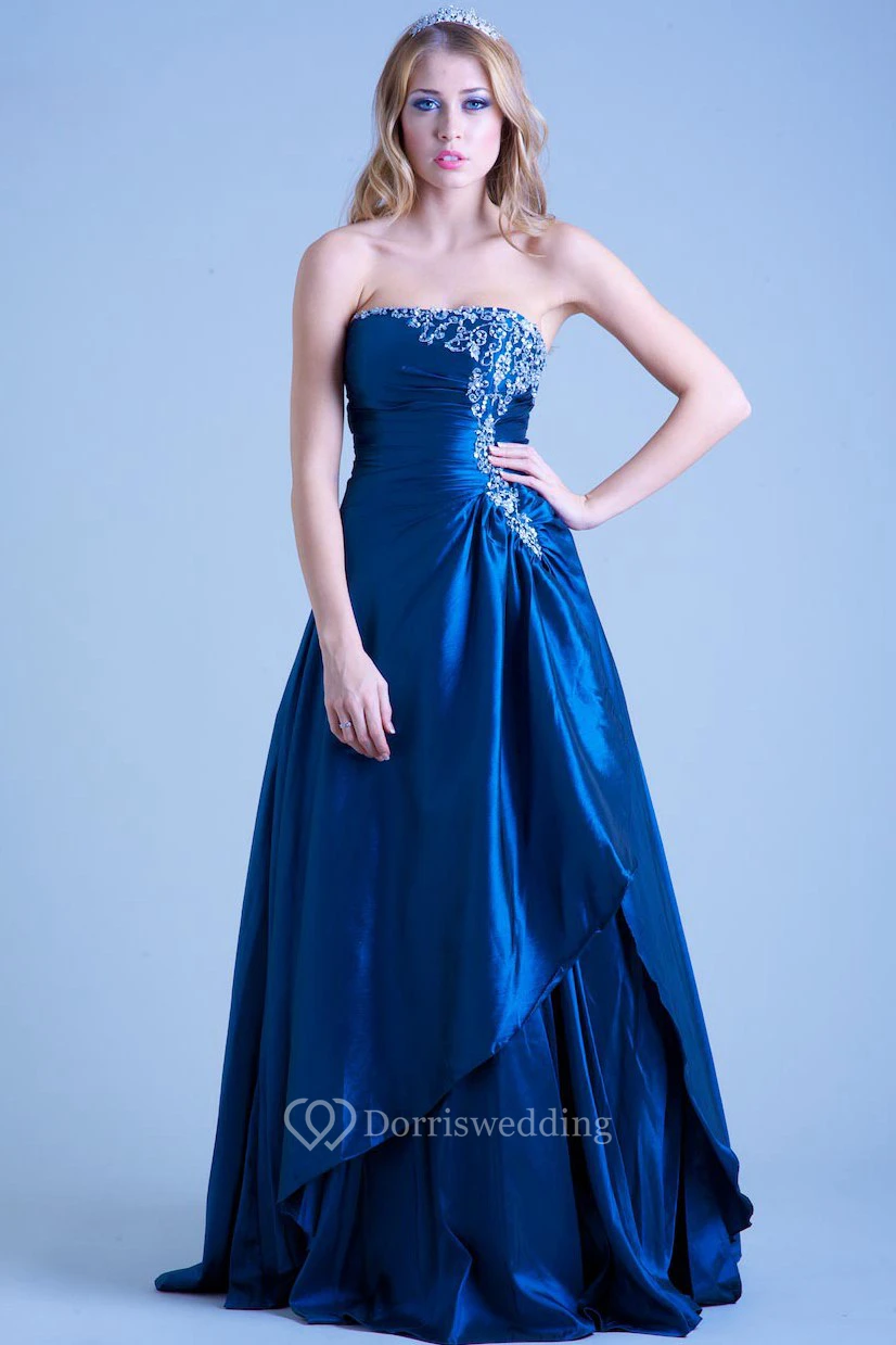 A-Line Sleeveless Strapless Floor-Length Beaded Satin Prom Dress With Draping