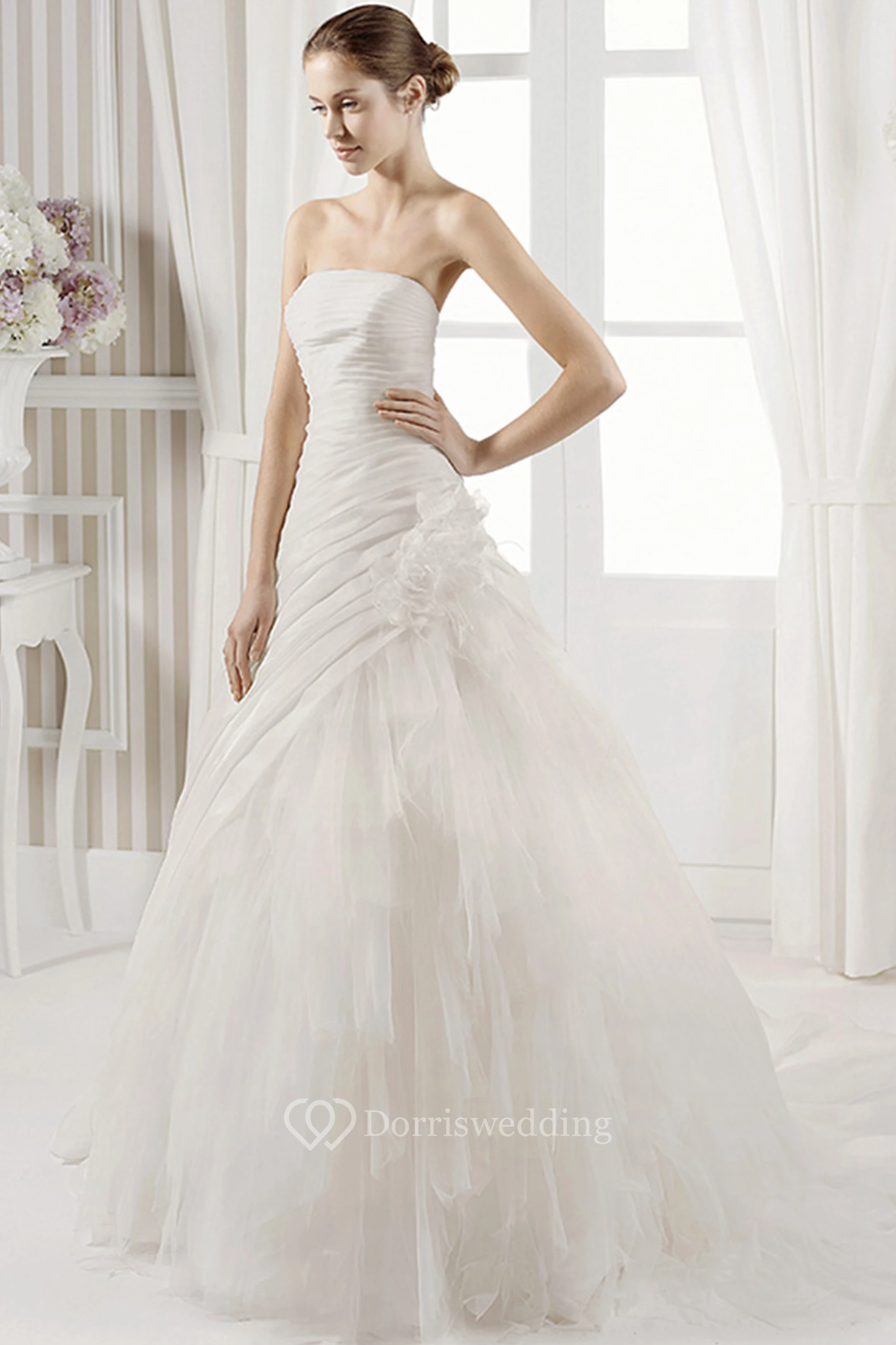 A-Line Sleeveless Strapless Floor-Length Floral Tulle Wedding Dress With Ruffles And Ruching