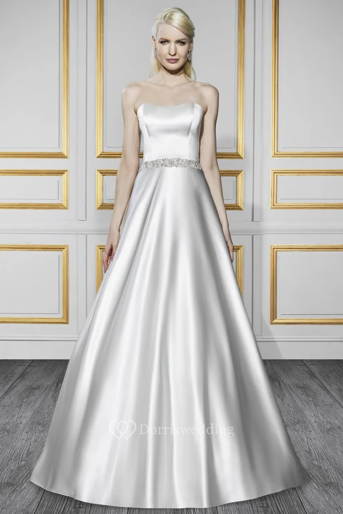 A-Line Sleeveless Strapless Floor-Length Jeweled Satin Wedding Dress With Bow And Backless Style