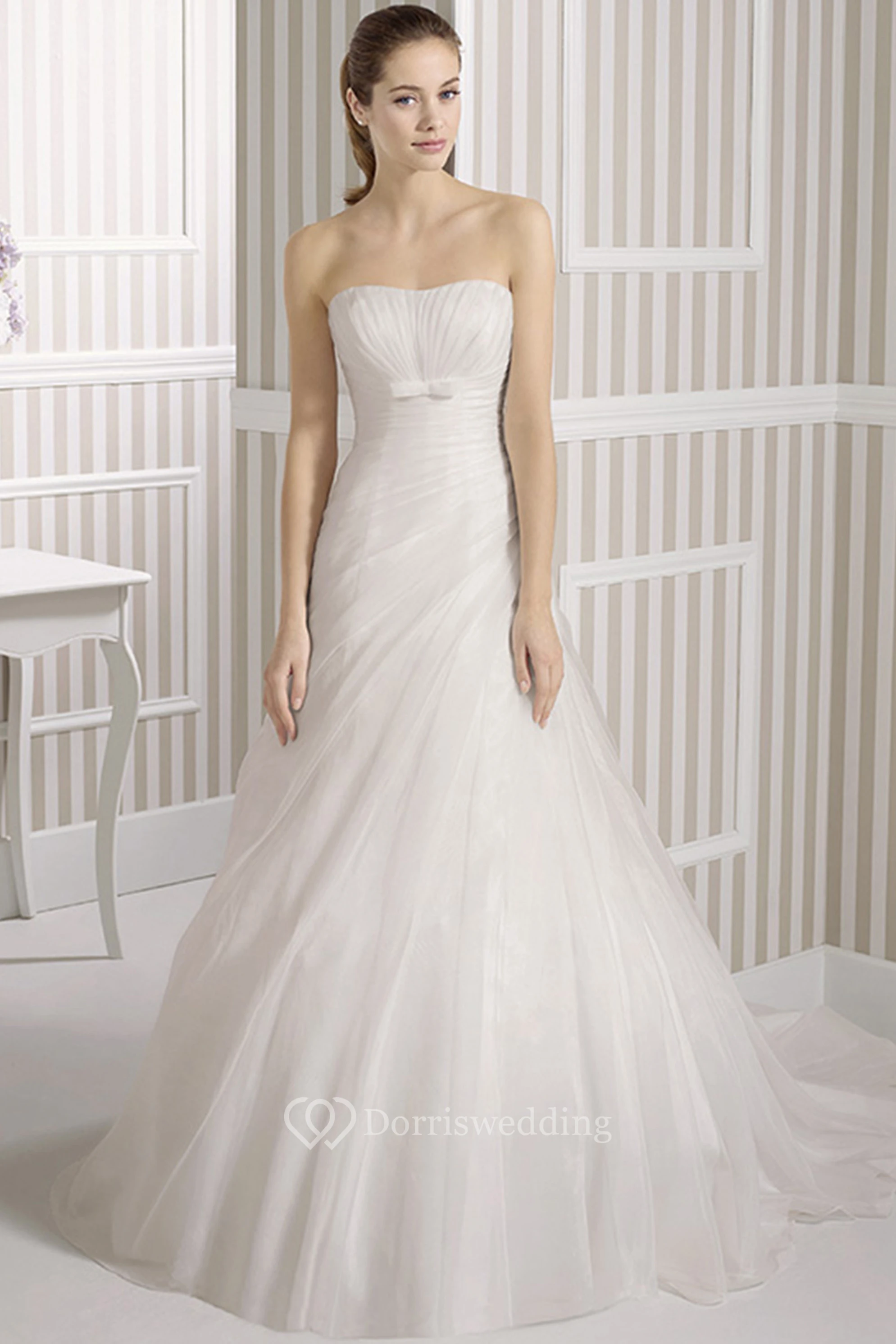 A-Line Sleeveless Strapless Floor-Length Side-Draped Tulle Wedding Dress With Cape
