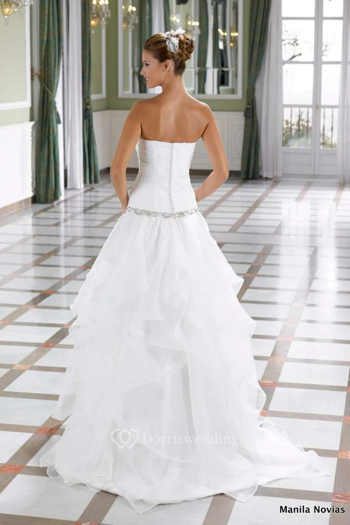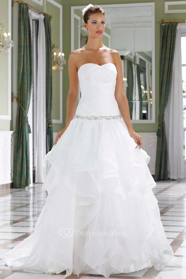 A-Line Sleeveless Strapless Long Cascading-Ruffle Organza Wedding Dress With Waist Jewellery And Ruching