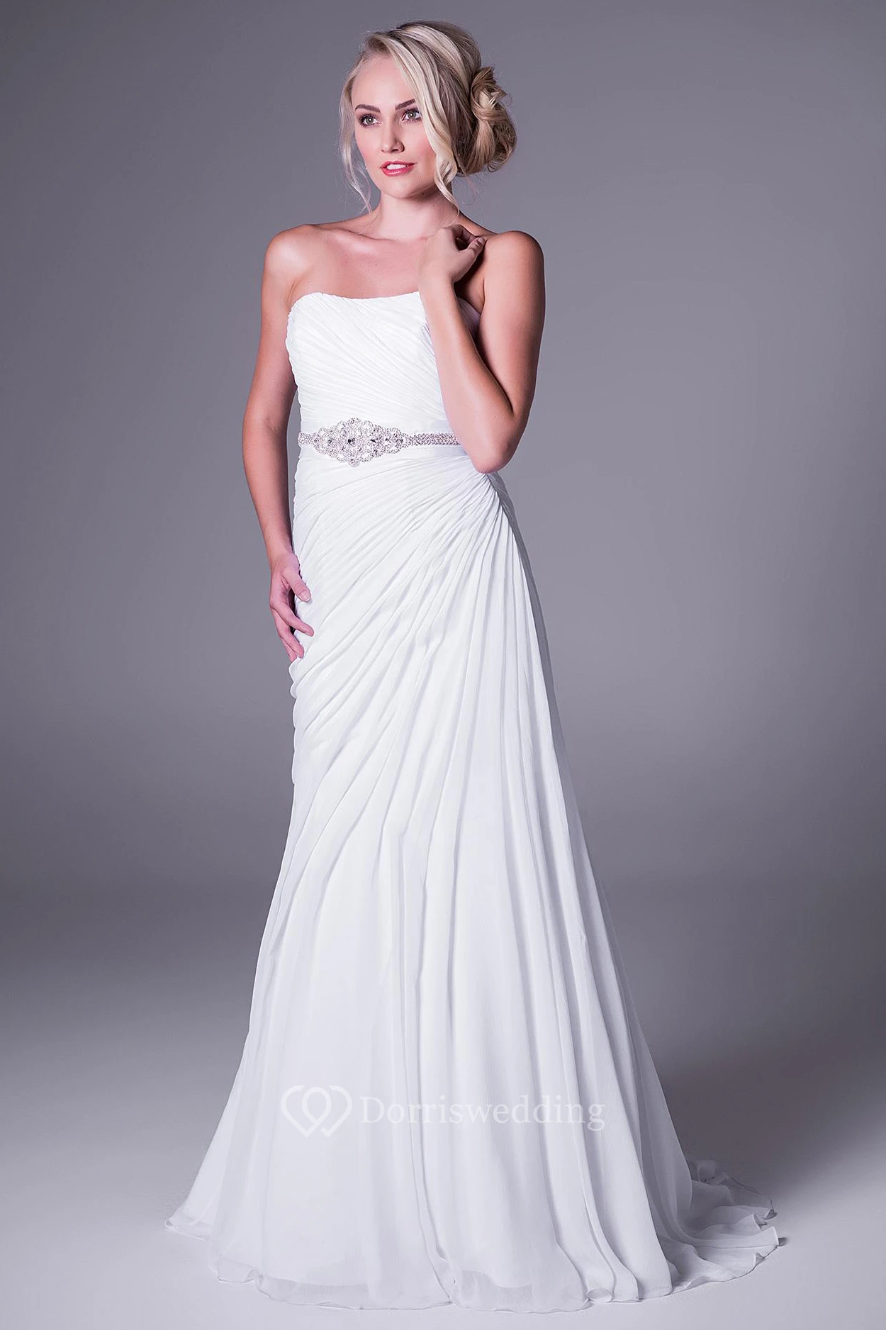 A-Line Sleeveless Strapless Side-Draped Long Chiffon Wedding Dress With Waist Jewellery