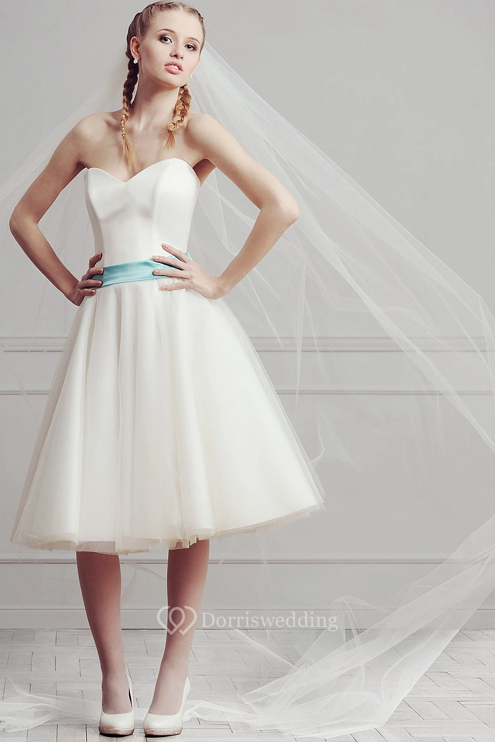 A-Line Sleeveless Sweetheart Knee-Length Satin&Tulle Wedding Dress