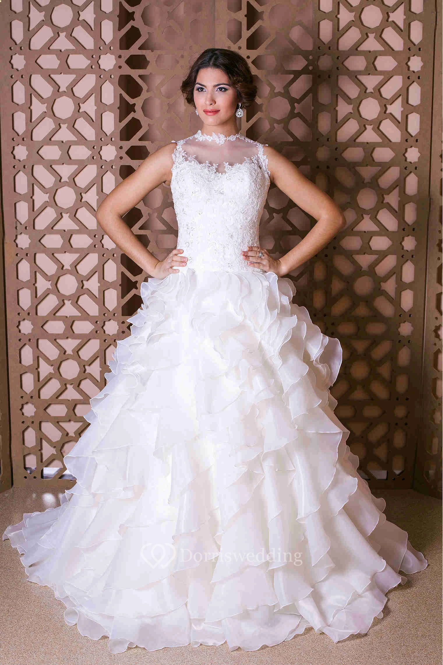 A-Line Sleeveless Tiered Maxi High-Neck Organza Wedding Dress With Appliques And Ruffles