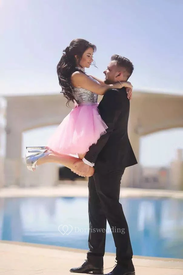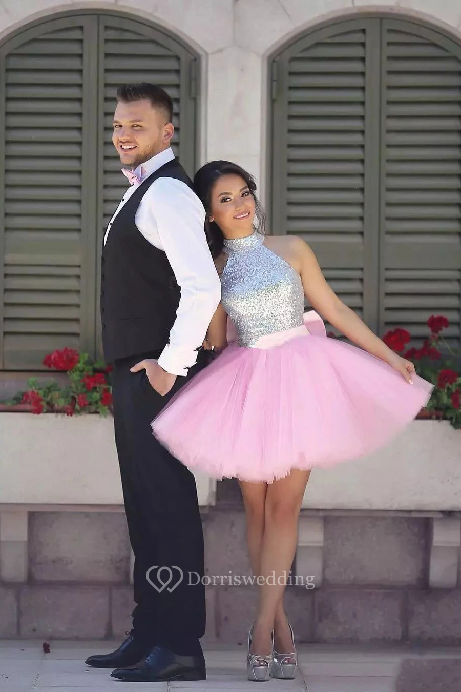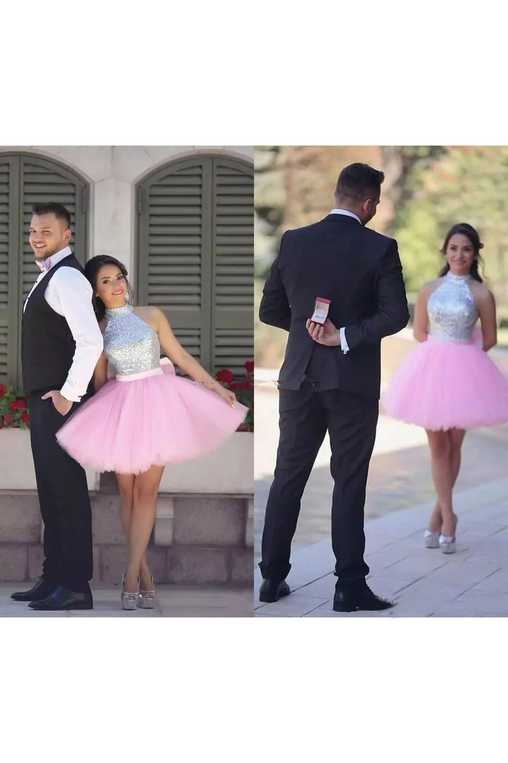 A-line Sleeveless Tulle Sequins Halter High Neck Zipper Short Mini Homecoming Dress