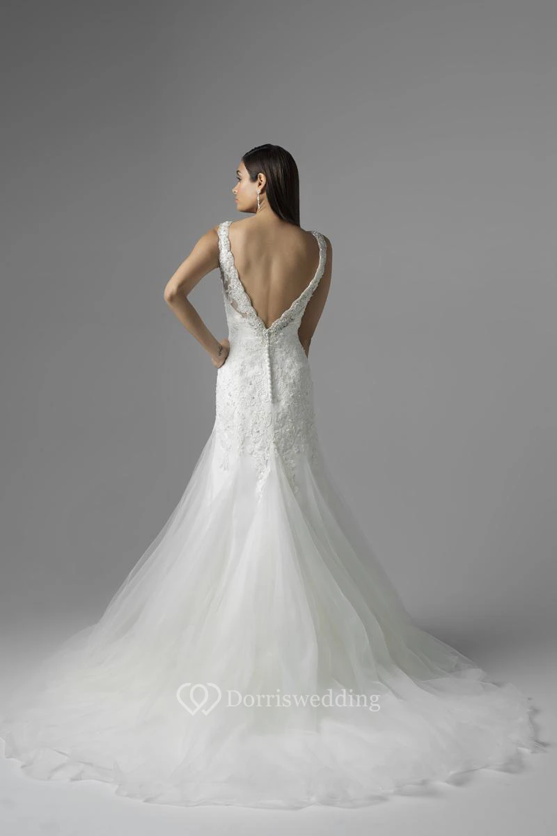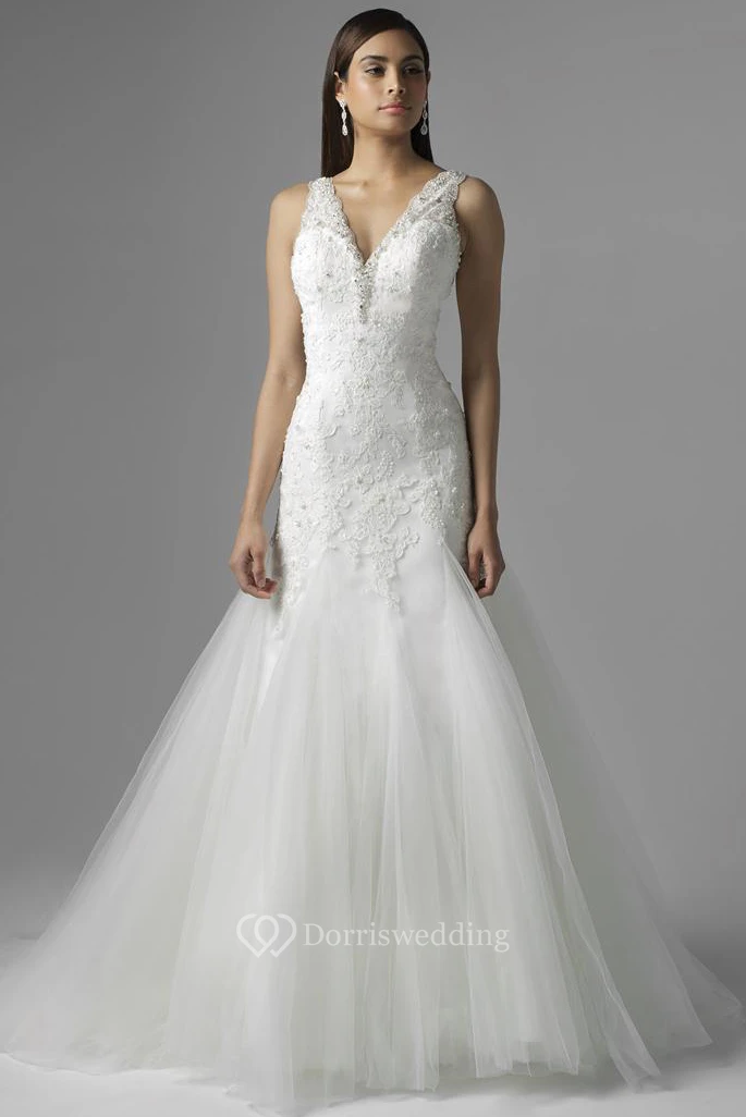 A-Line Sleeveless V-Neck Floor-Length Appliqued Tulle&Lace Wedding Dress With Beading And Deep-V Back