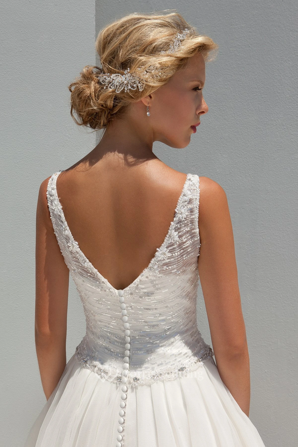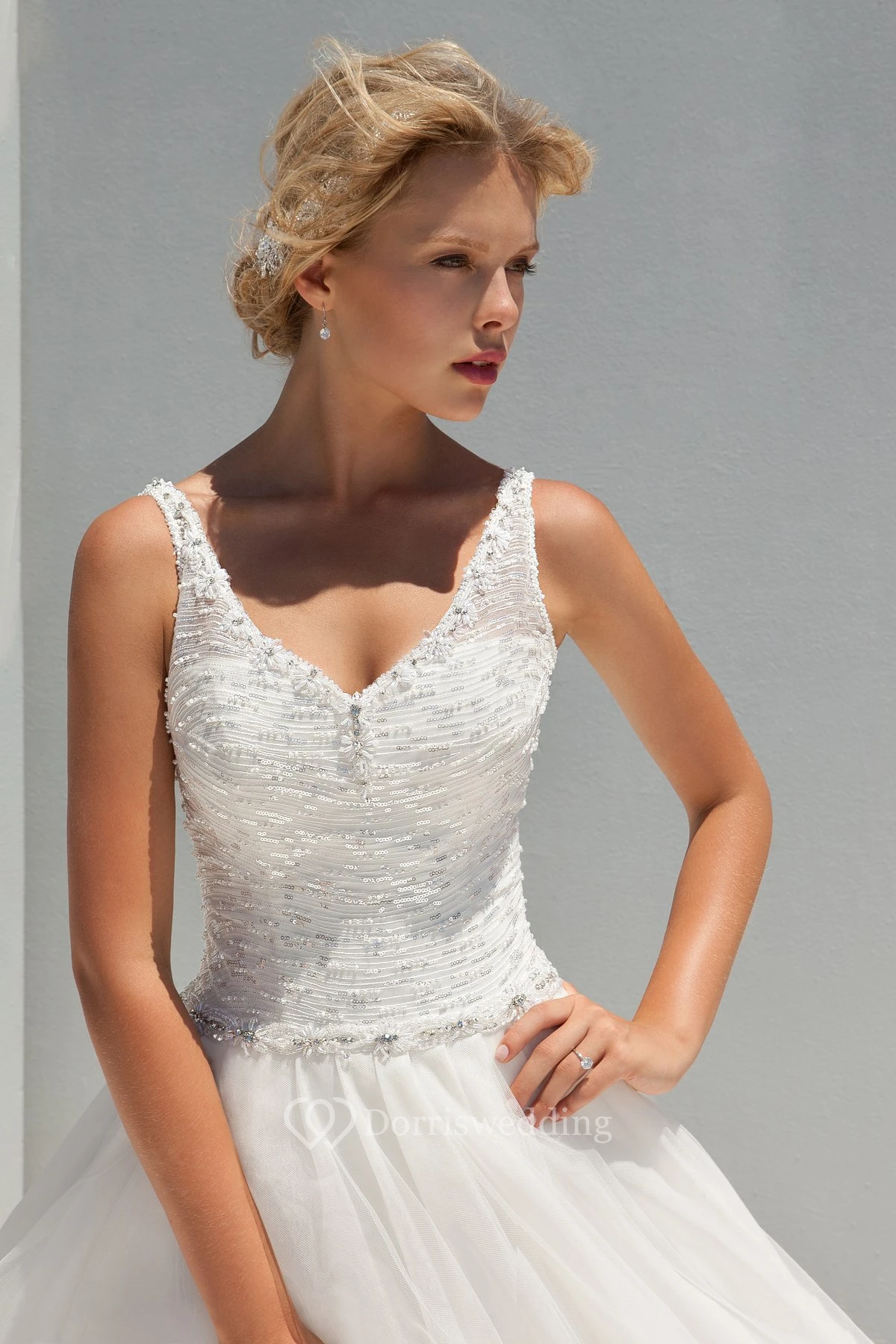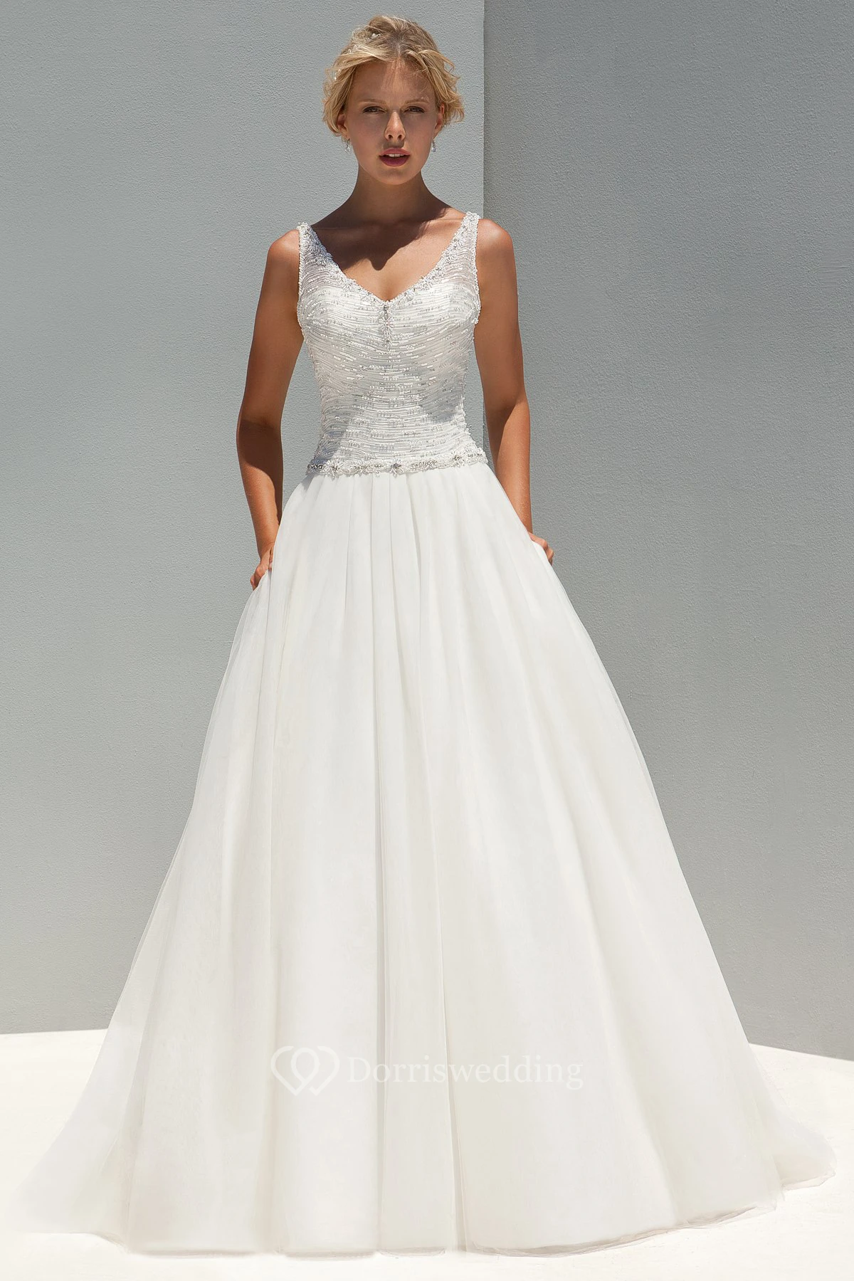 A-Line Sleeveless V-Neck Sequined Long Wedding Dress With Beading And Ruching