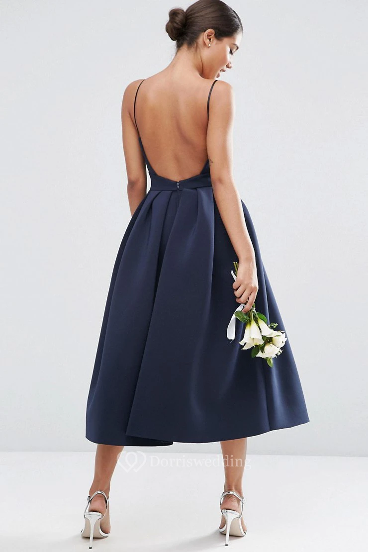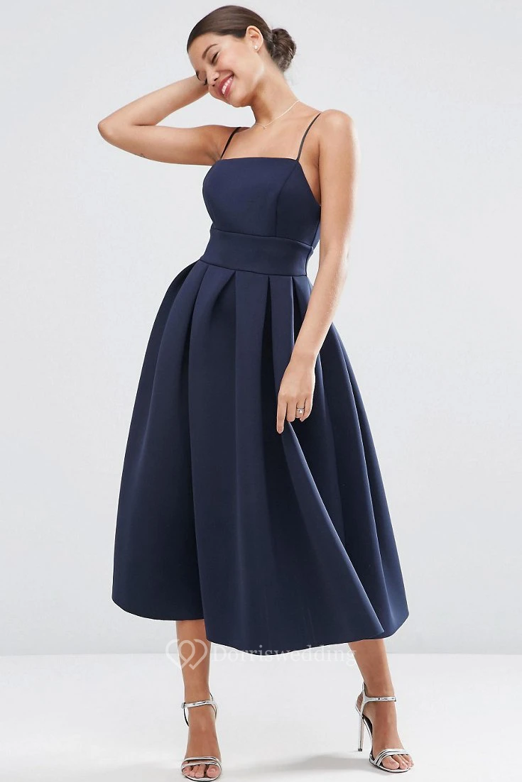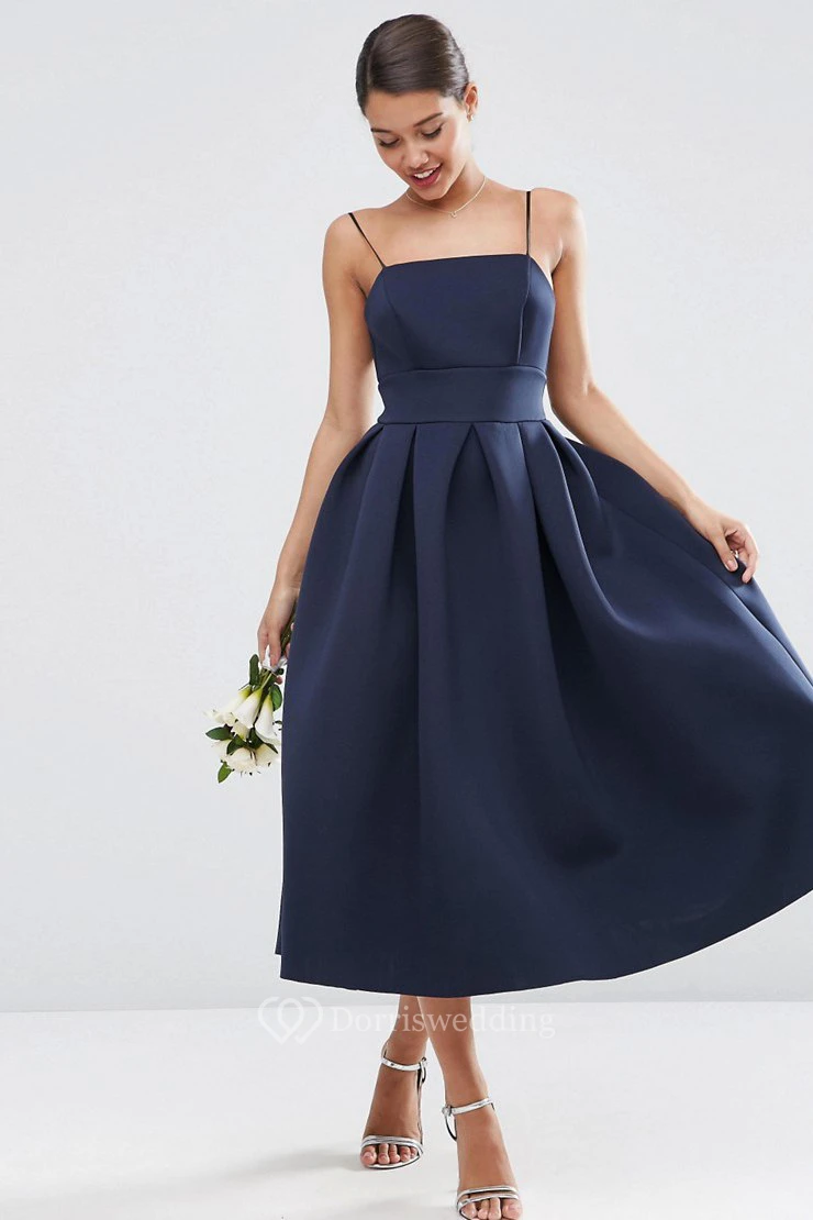 A-Line Spaghetti Tea-Length Sleeveless Satin Bridesmaid Dress