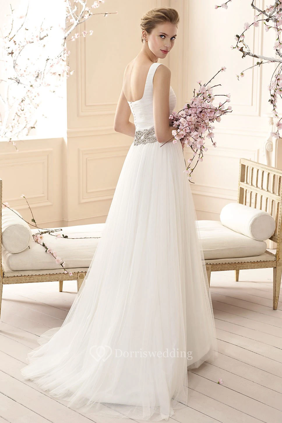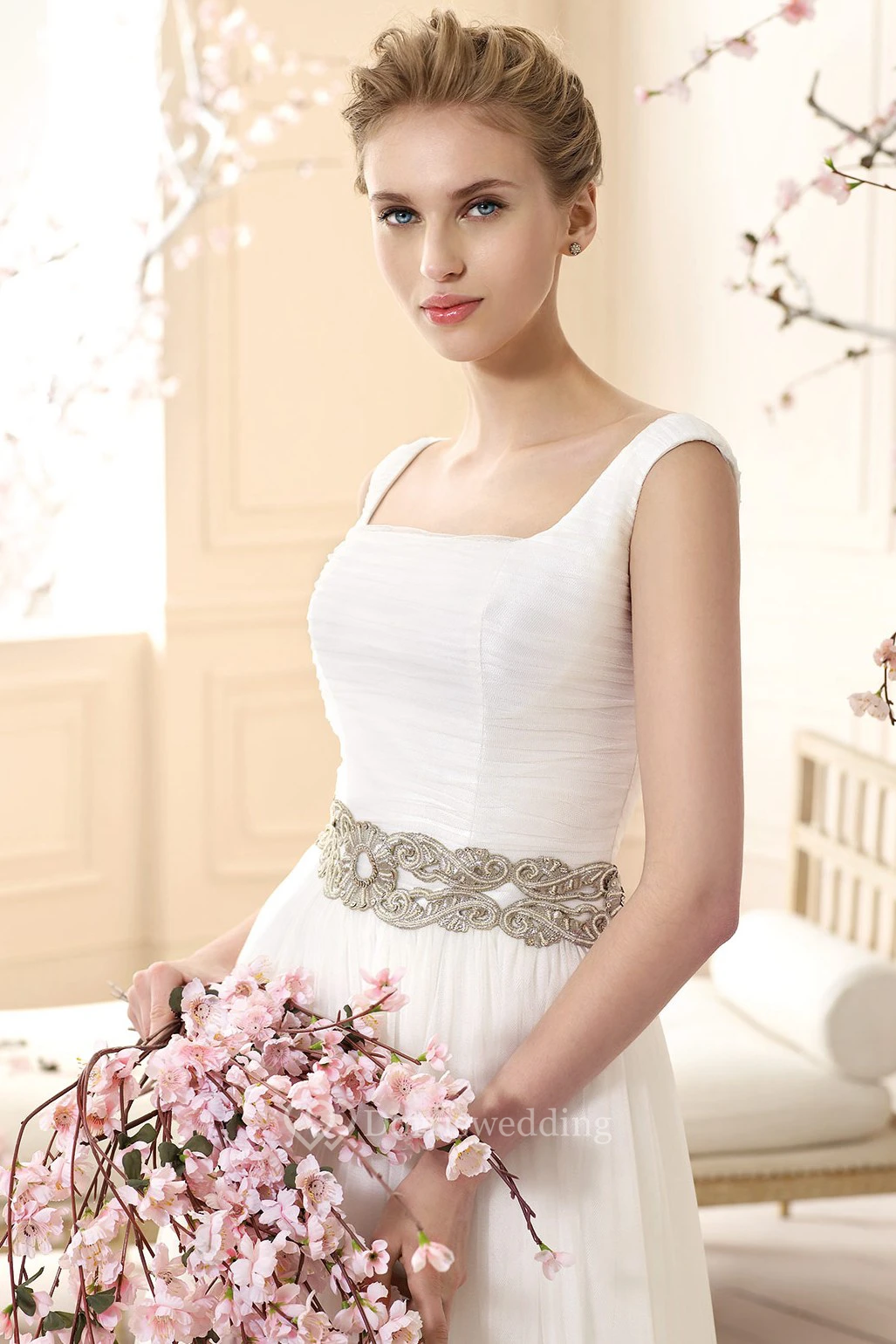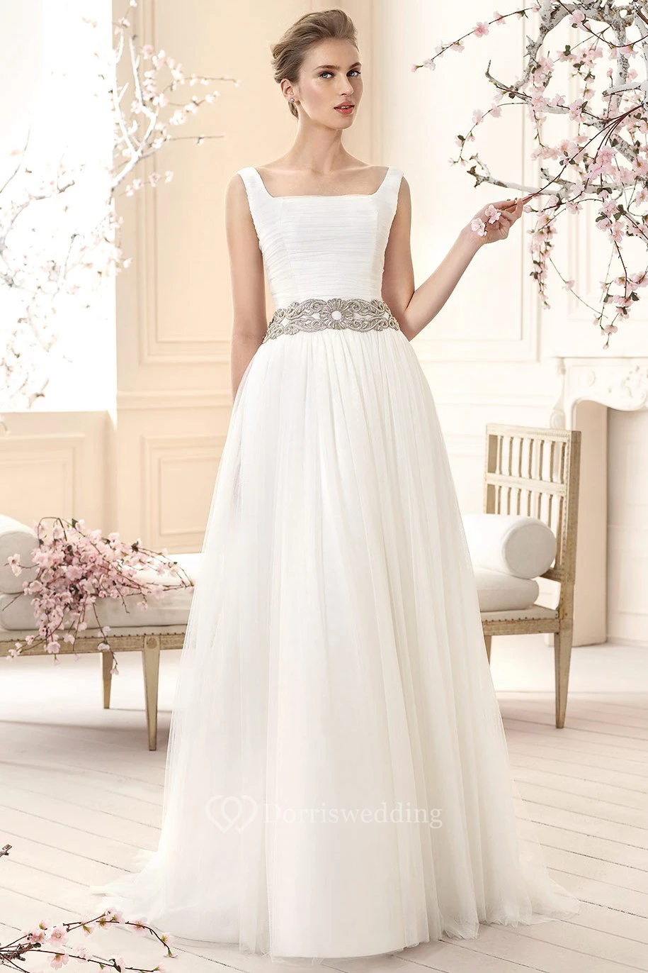 A-Line Square-Neck Sleeveless Ruched Maxi Tulle Wedding Dress With Waist Jewellery
