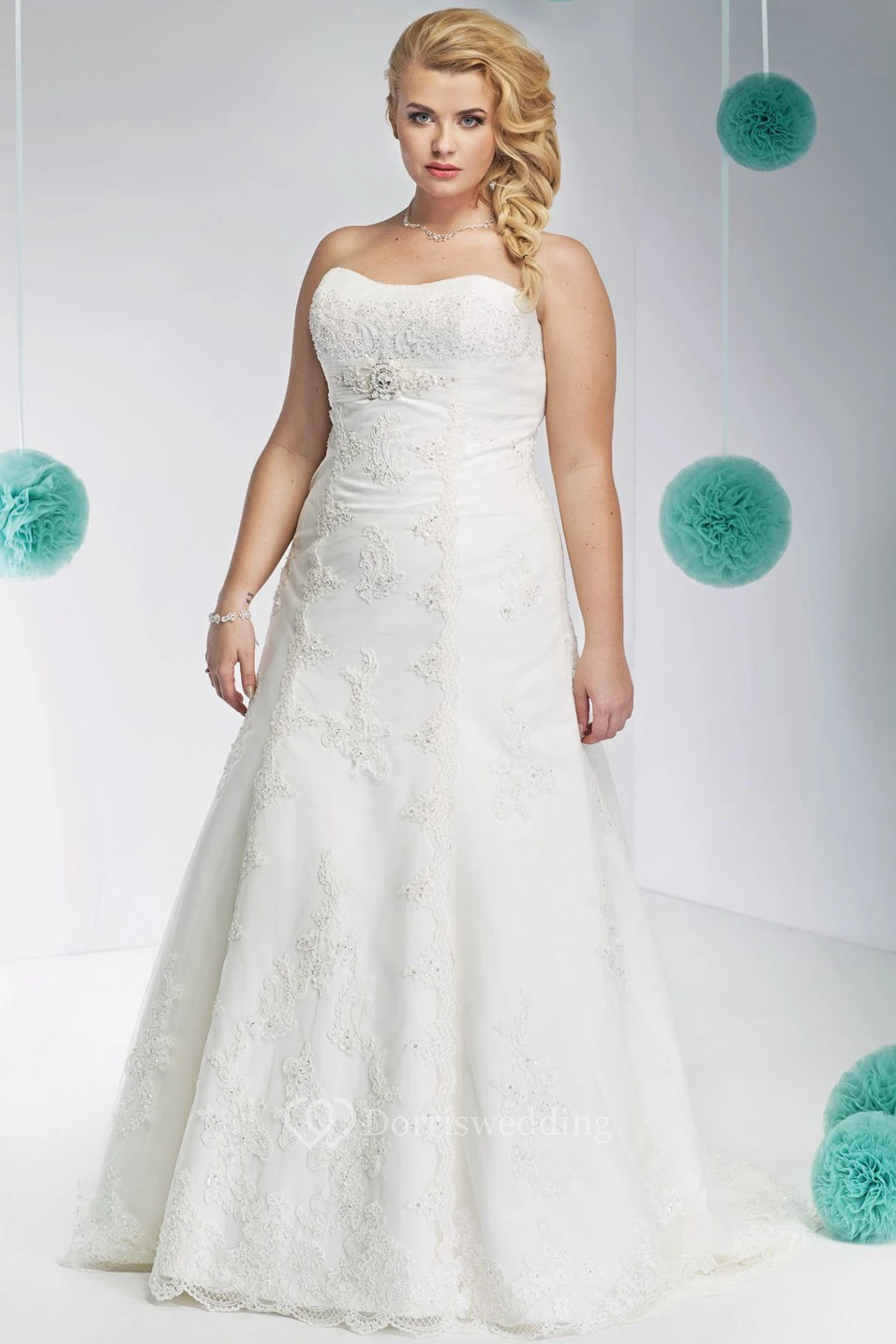 A-Line Strapless Appliqued Long Sleeveless Lace Plus Size Wedding Dress With Broach