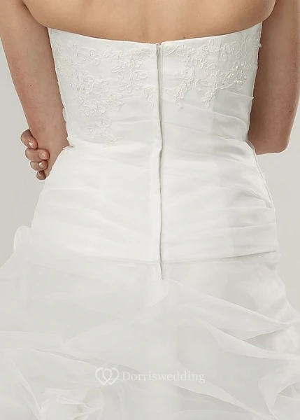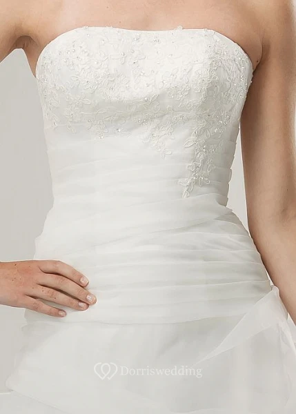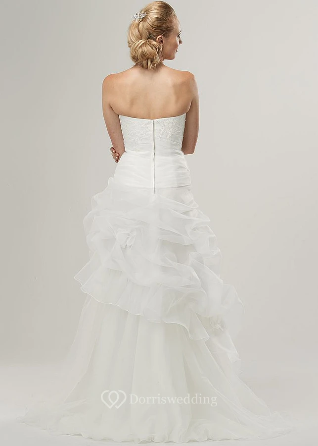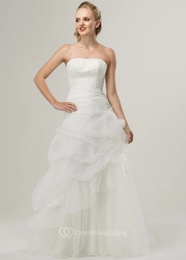 A-Line Strapless Appliqued Sleeveless Long Tulle&Lace Wedding Dress With Pick Up And Flower