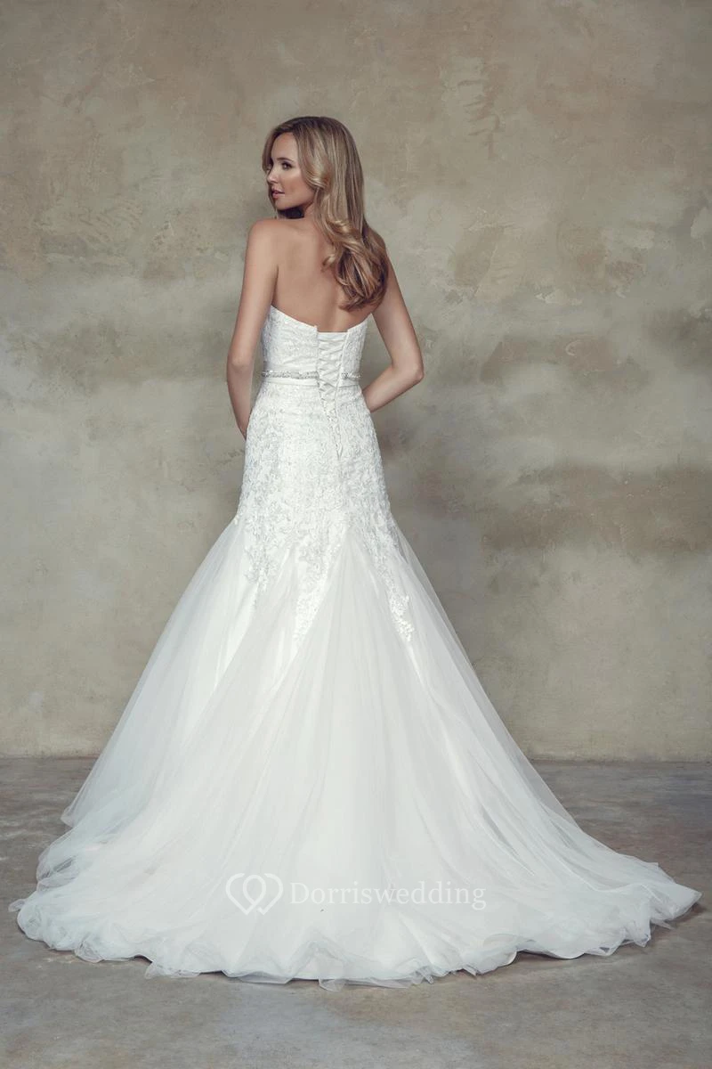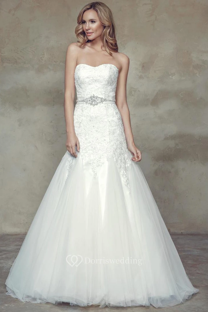 A-Line Strapless Appliqued Sleeveless Maxi Lace&Tulle Wedding Dress With Waist Jewellery And Lace-Up Back
