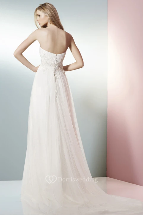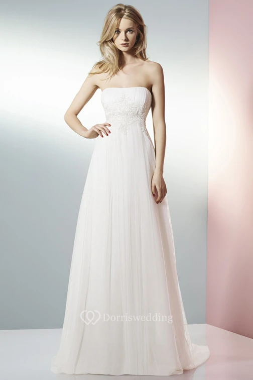 A-Line Strapless Appliqued Tulle Wedding Dress With Brush Train