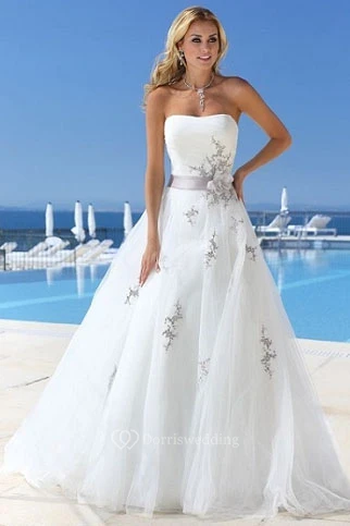 A-Line Strapless Appliqued Tulle Wedding Dress With Flower