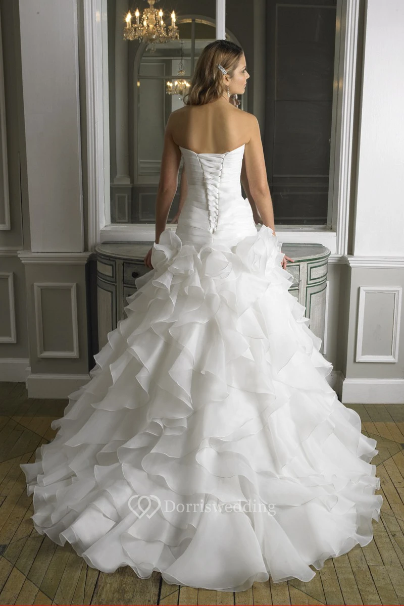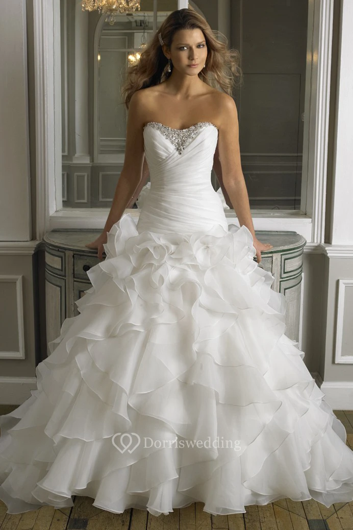A-Line Strapless Beaded Organza Wedding Dress With Cascading Ruffles And Ruching