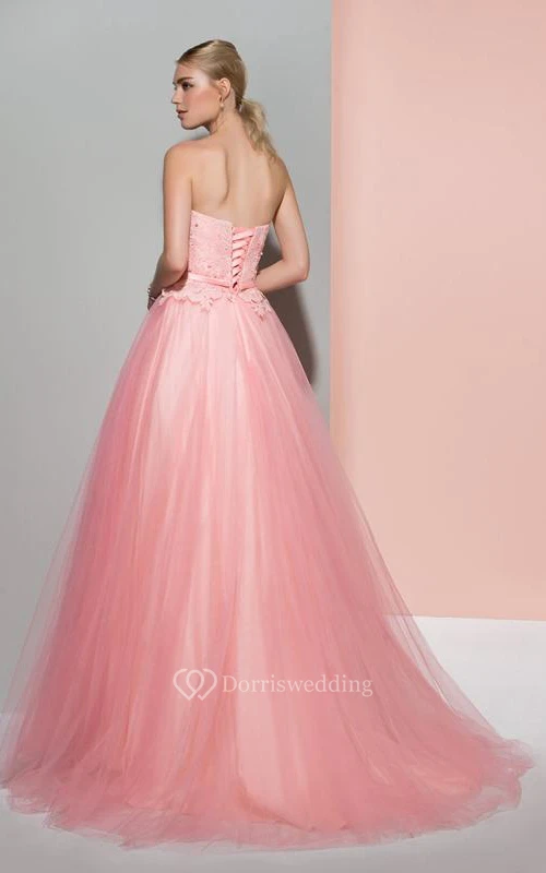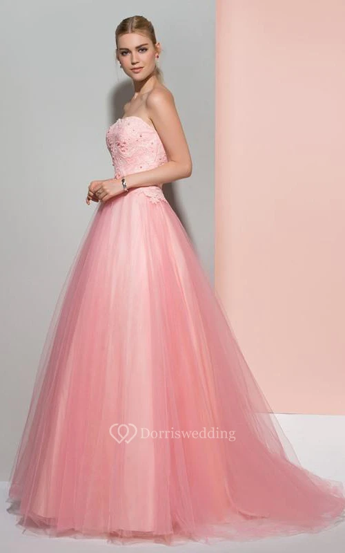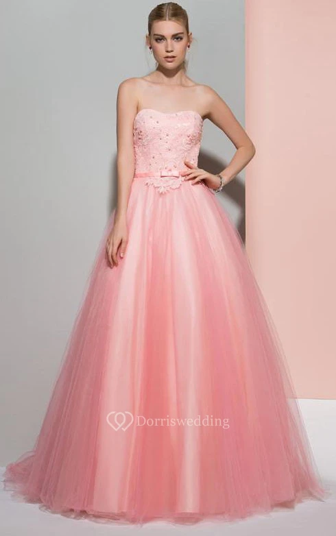 A-Line Strapless Beading Lace Sashes Sweep Train Prom Dress