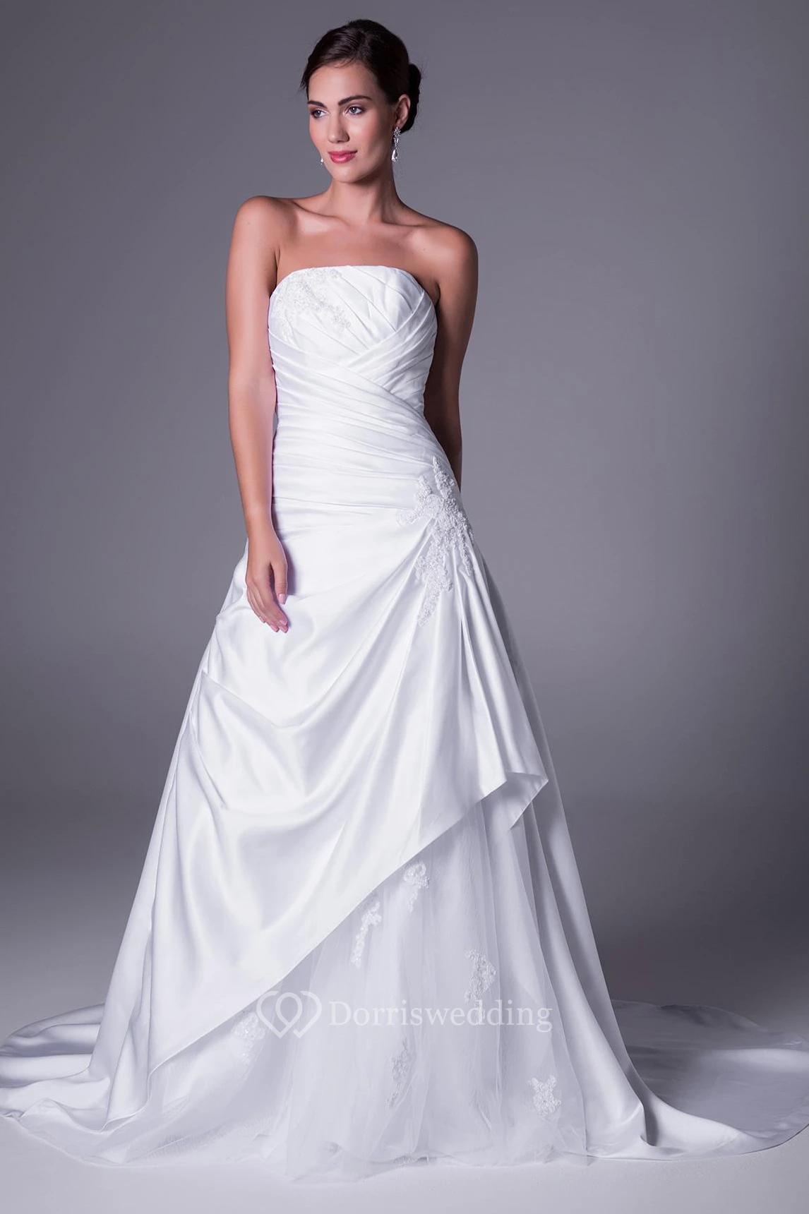 A-Line Strapless Floor-Length Side-Draped Sleeveless Satin Wedding Dress With Appliques