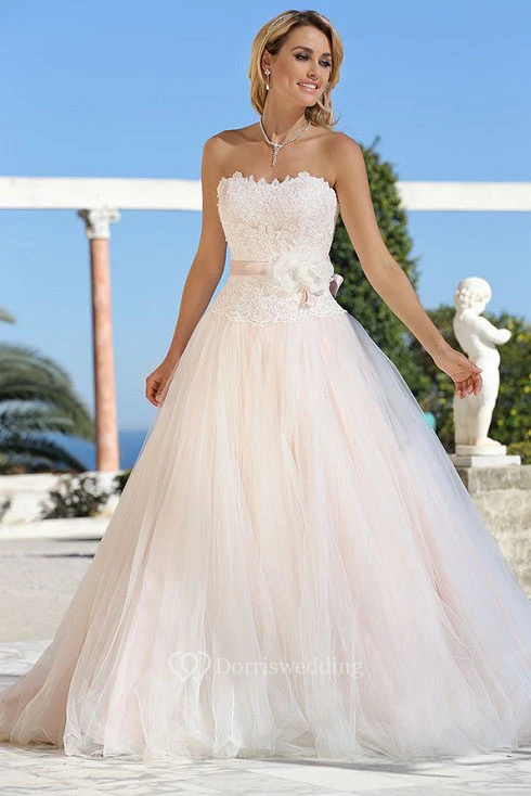 A-Line Strapless Floor-Length Sleeveless Appliqued Tulle Wedding Dress With Flower And Ruffles