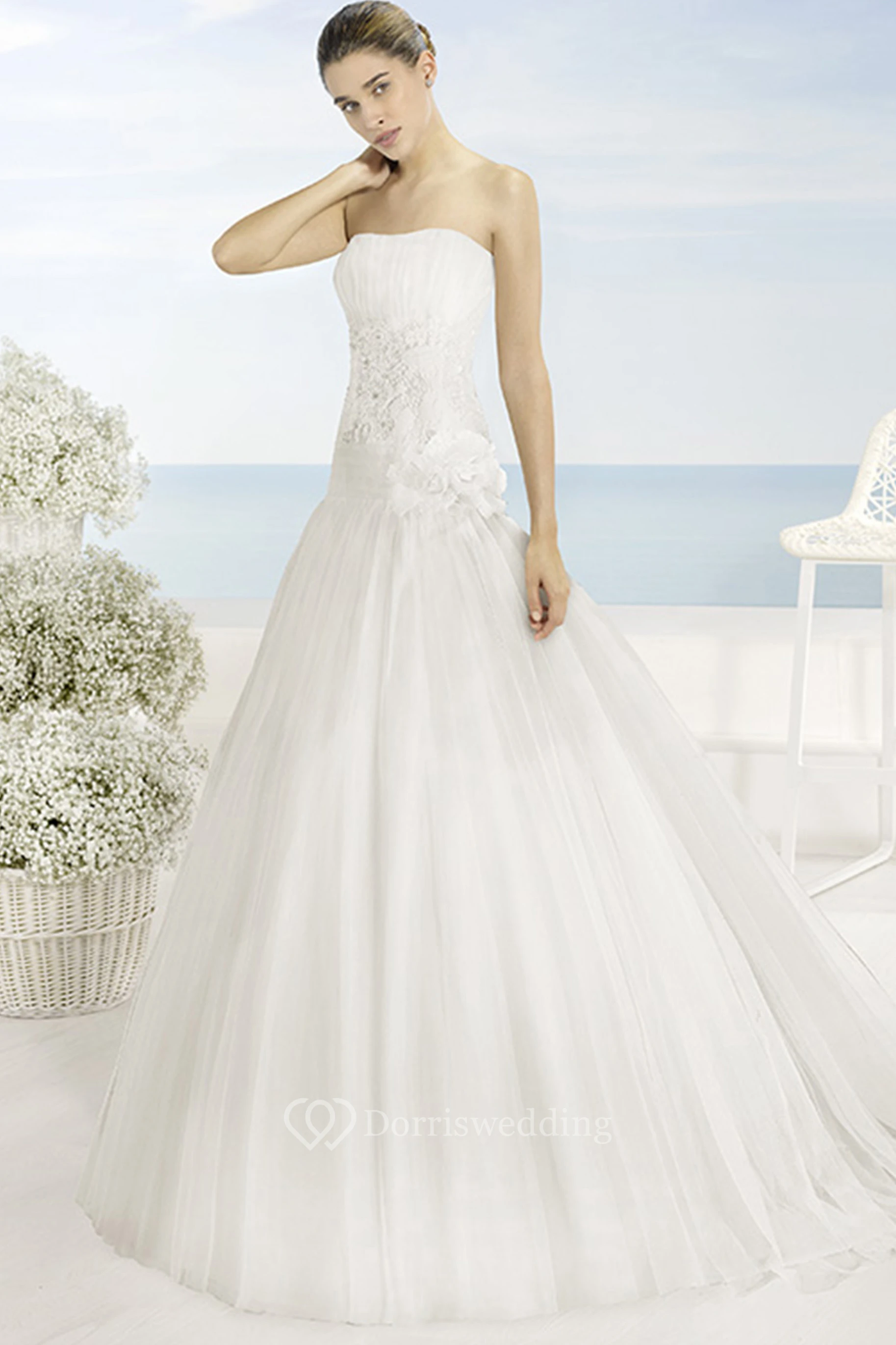 A-Line Strapless Floor-Length Sleeveless Floral Tulle Wedding Dress With Appliques And Pleats