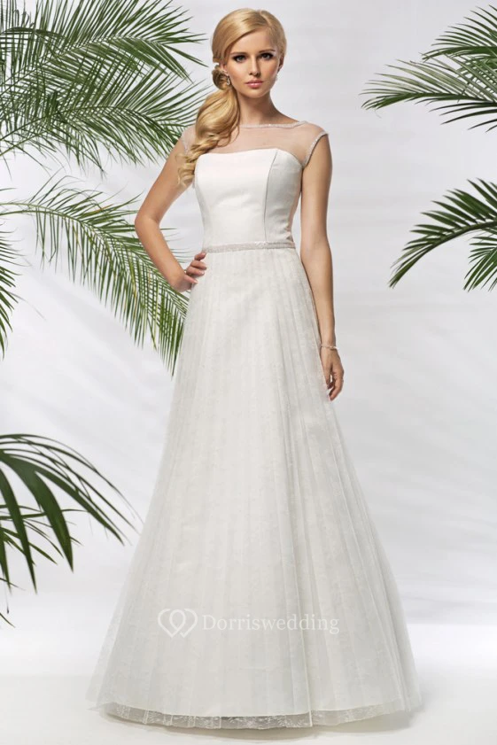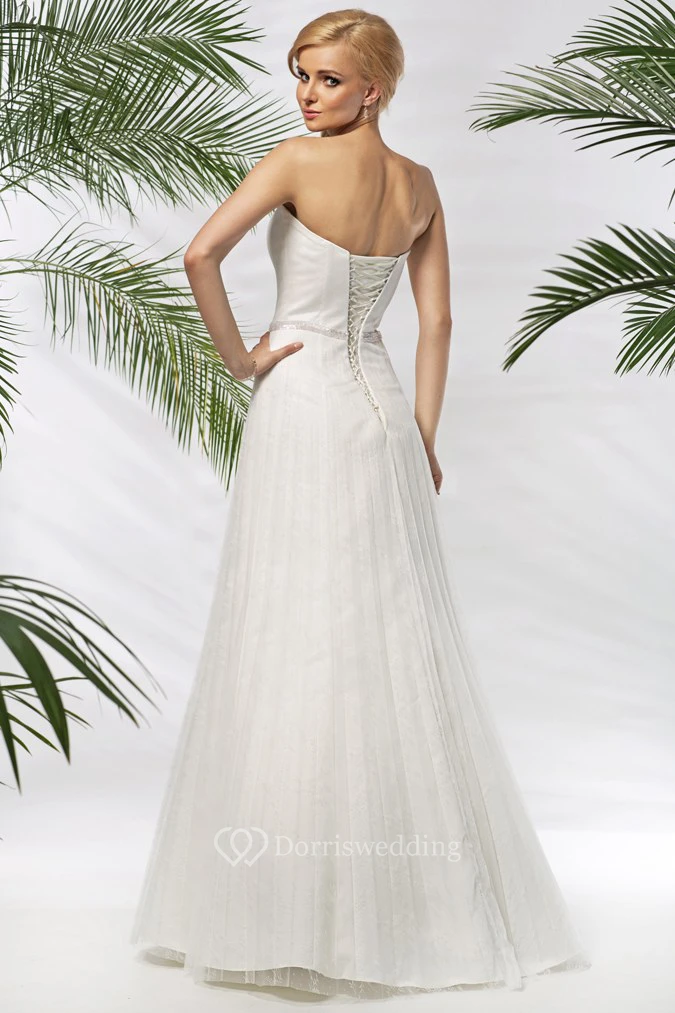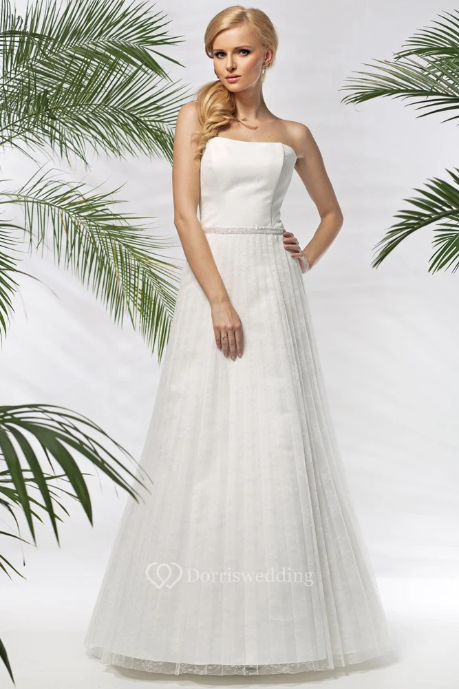 A-Line Strapless Long Pleated Satin&Tulle Wedding Dress With Waist Jewellery And Corset Back