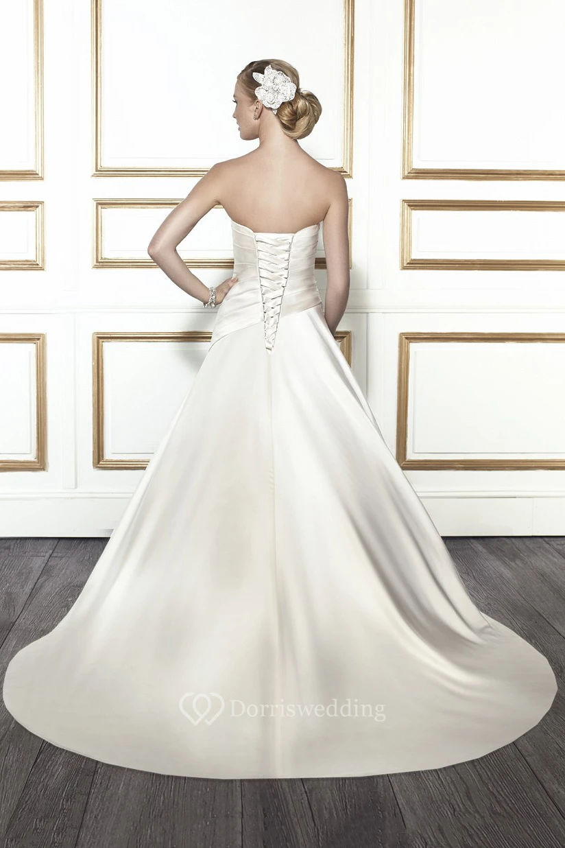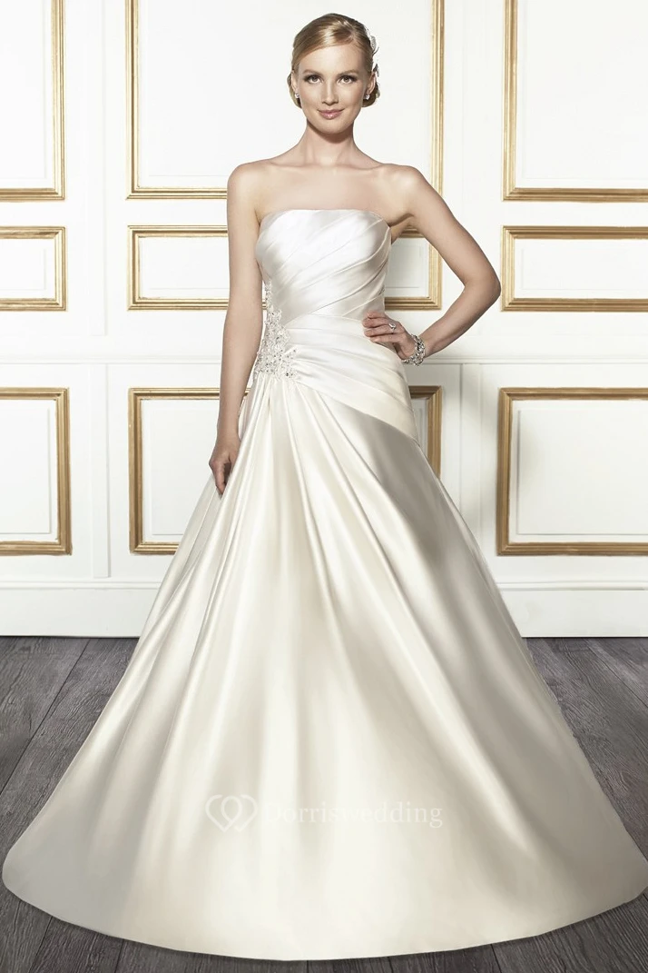 A-Line Strapless Side-Draped Sleeveless Floor-Length Satin Wedding Dress With Beading And Lace-Up Back