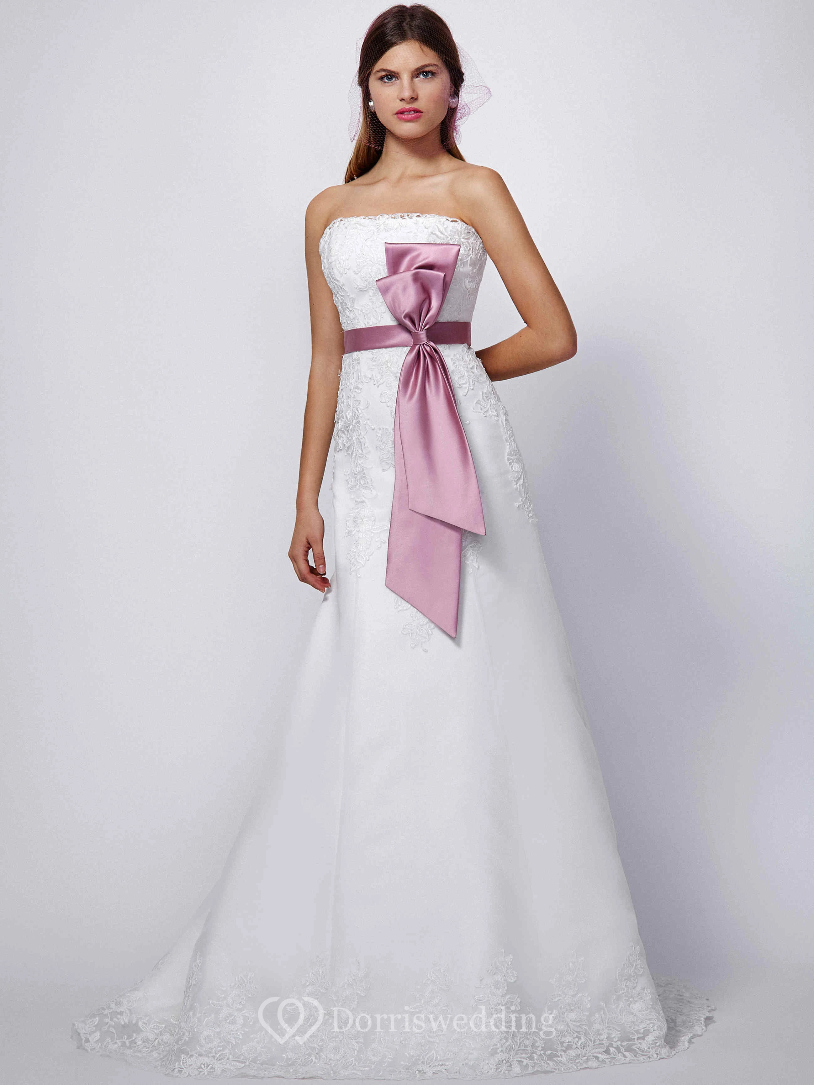 A-Line Strapless Sleeveless Appliqued Long Satin&Lace Wedding Dress With Bow