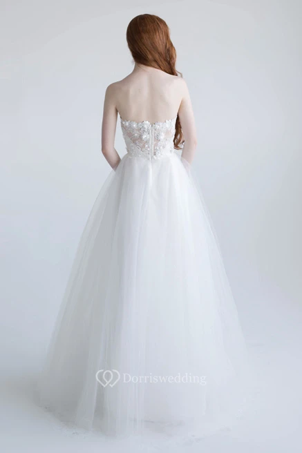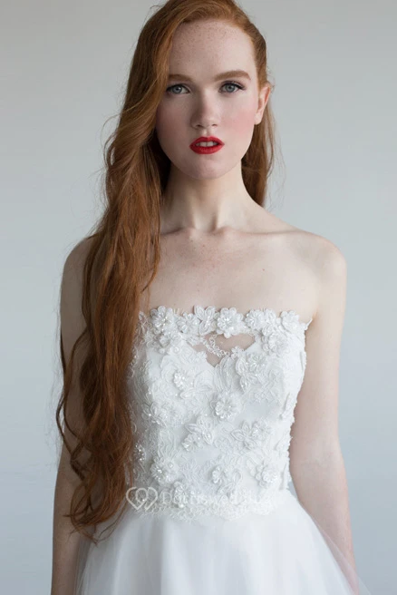 A-Line Strapless Sleeveless Maxi Floral Tulle Wedding Dress With Appliques