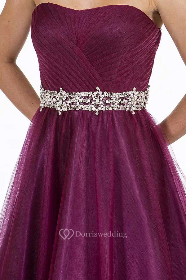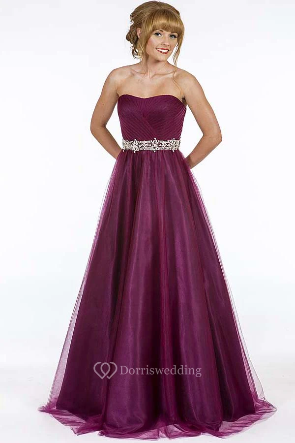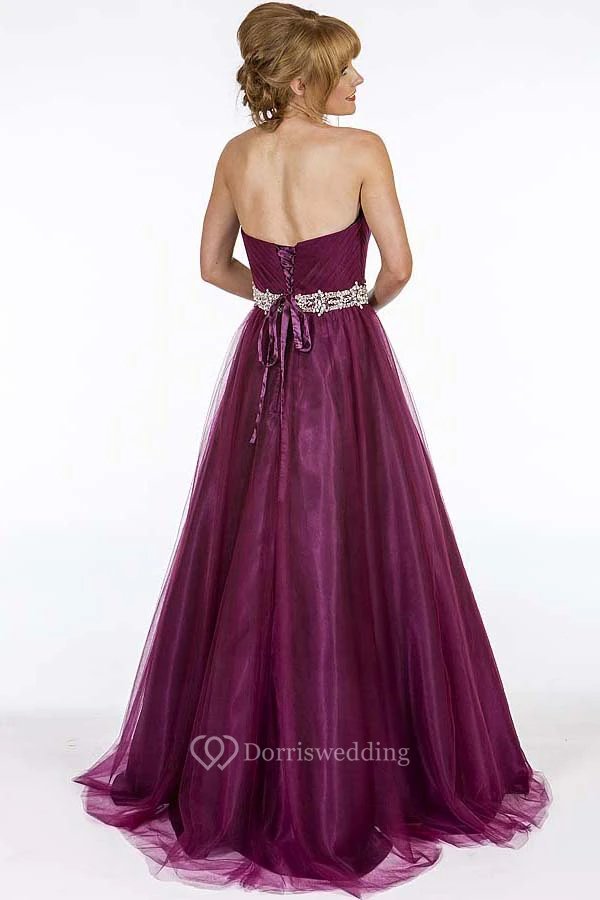A-Line Strapless Sleeveless Maxi Ruched Tulle Prom Dress With Lace-Up Back And Waist Jewellery