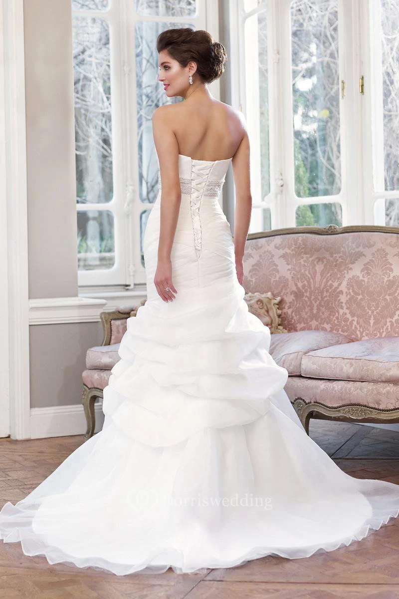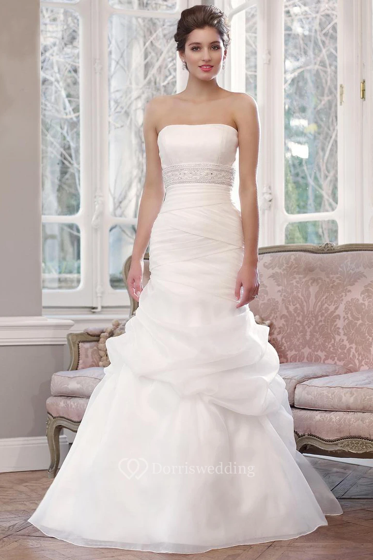 A-Line Strapless Sleeveless Pick-Up Floor-Length Organza&Satin Wedding Dress With Waist Jewellery And Ruching