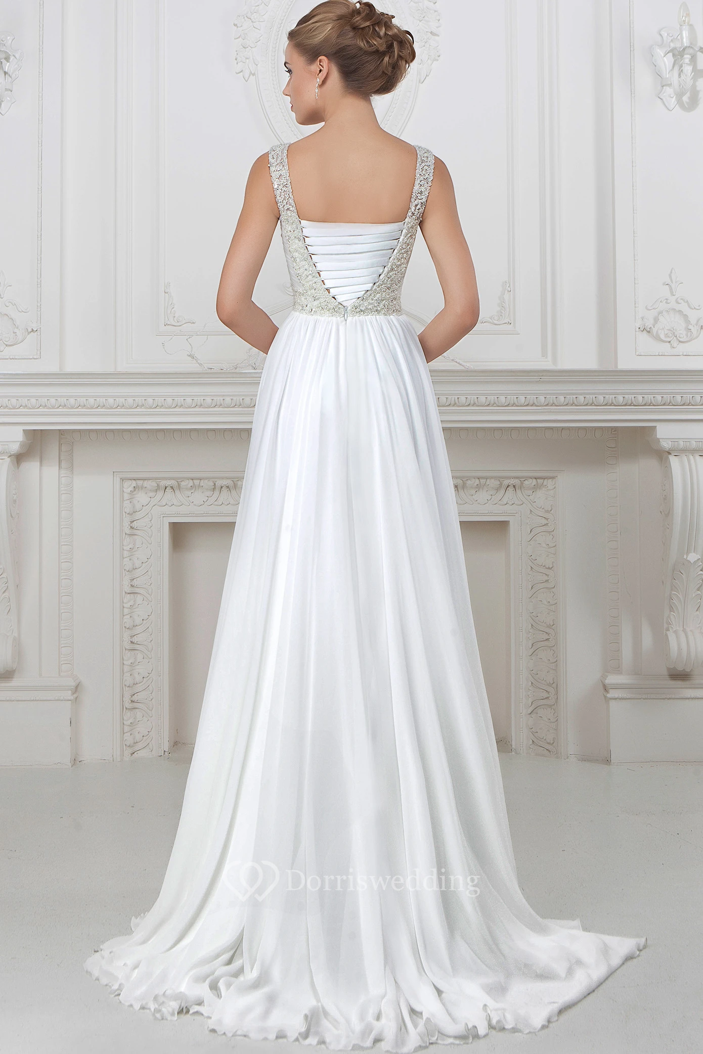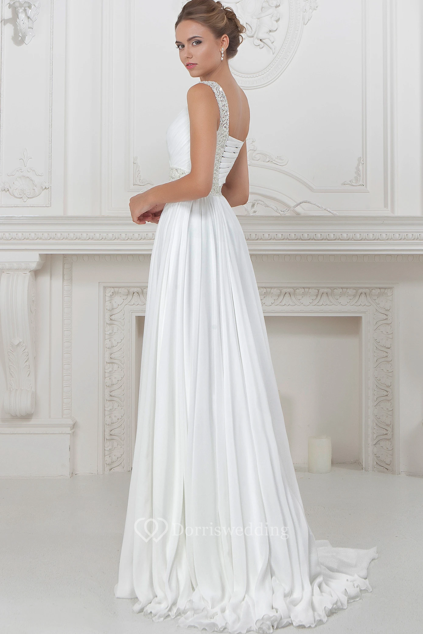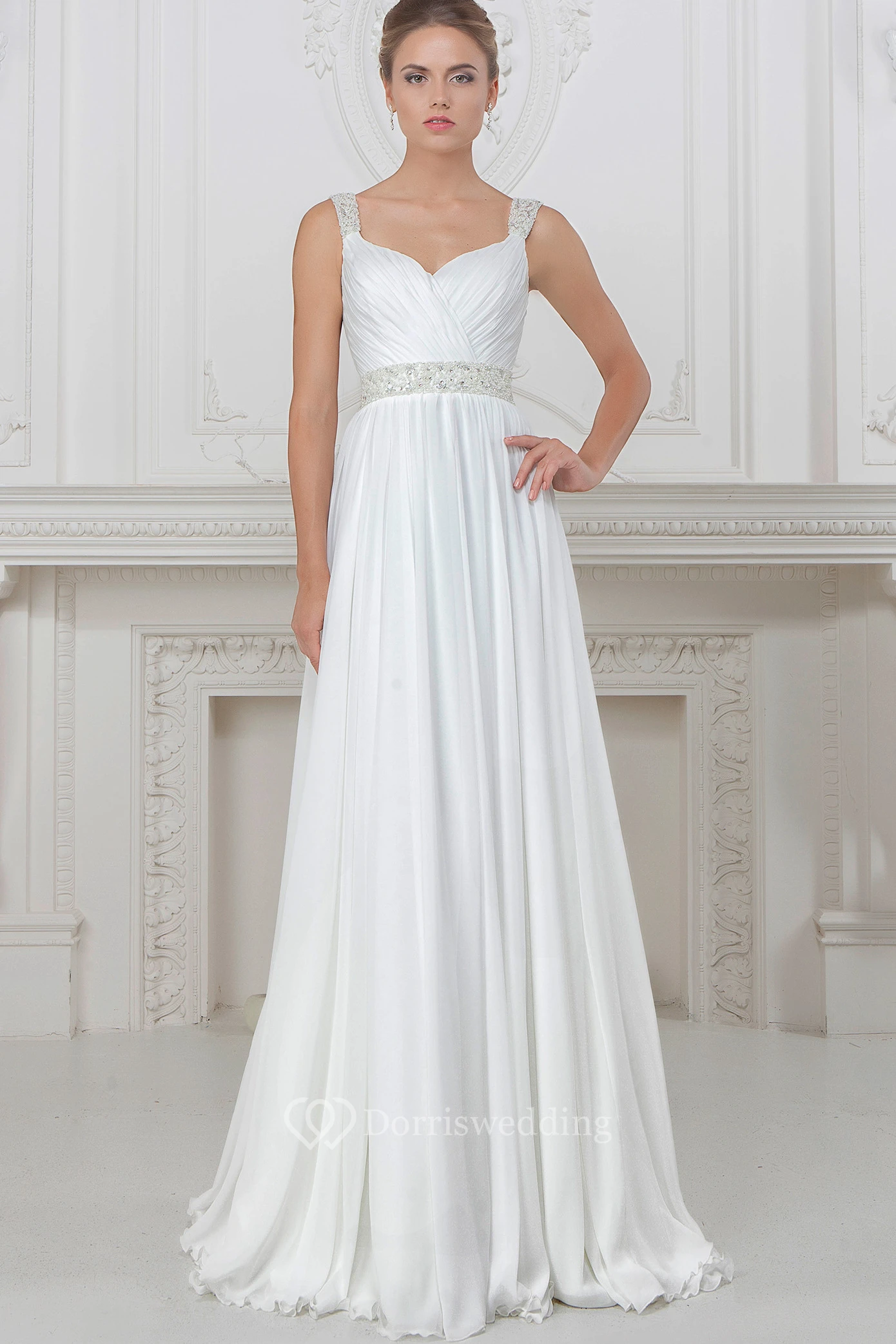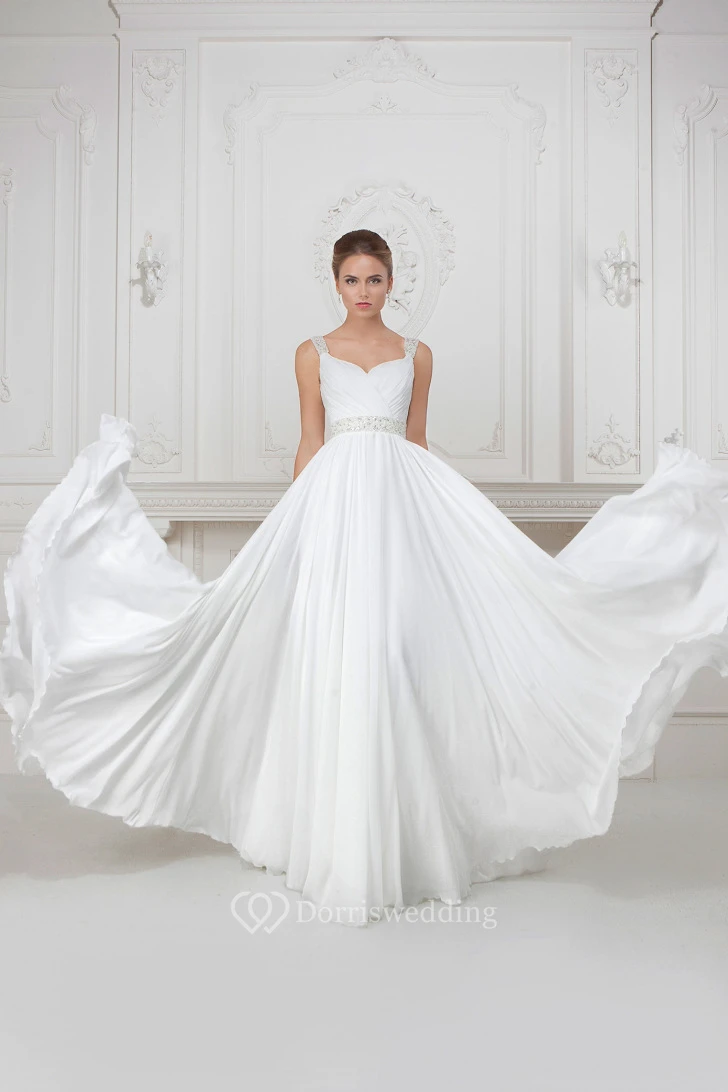 A-Line Strapped Sleeveless Beaded Long Chiffon Wedding Dress With Pleats And Waist Jewellery