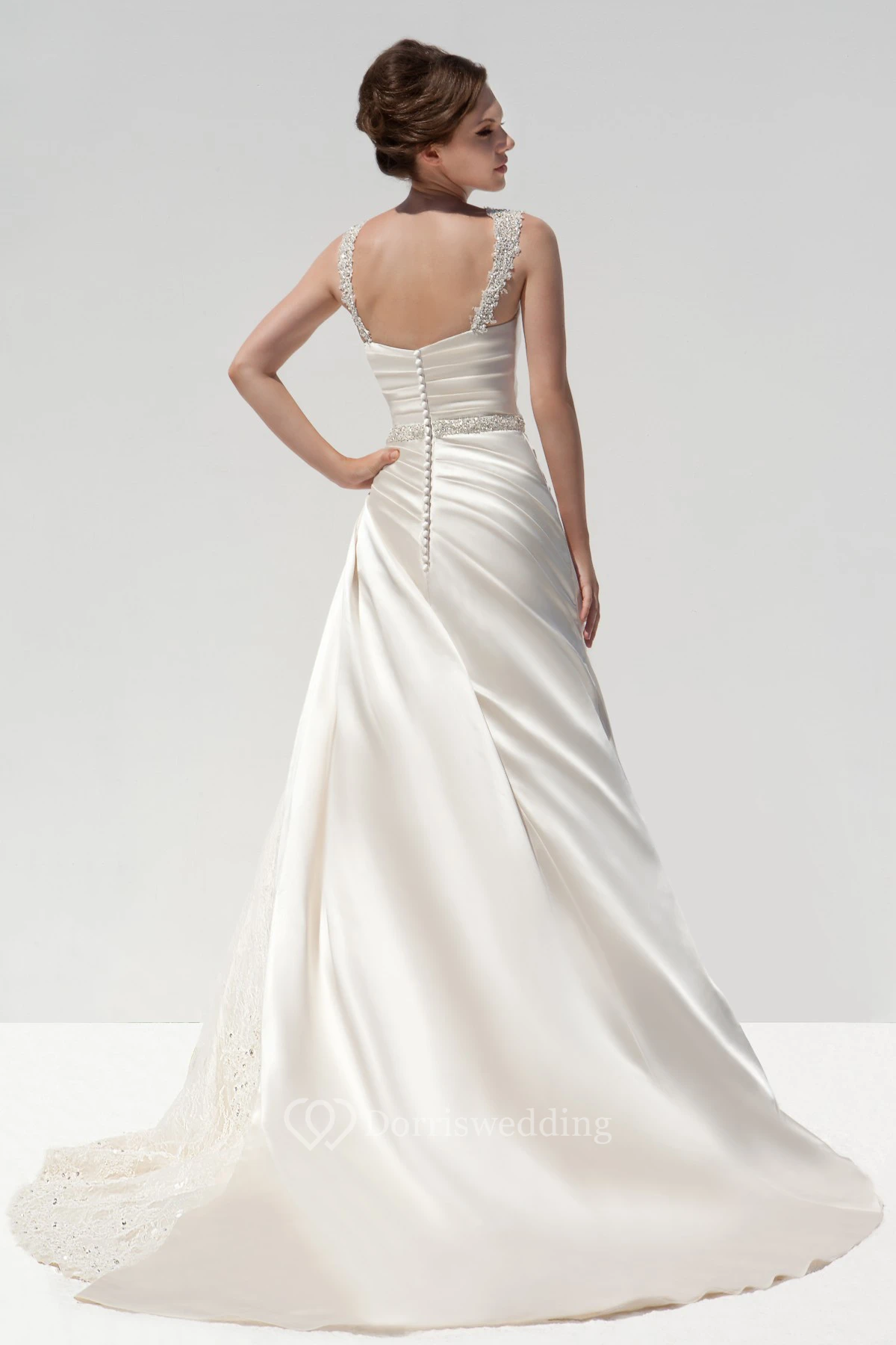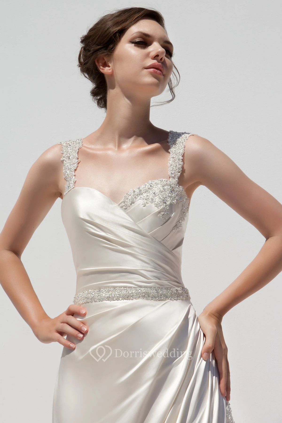 A-Line Strapped Sleeveless Beaded Long Satin Wedding Dress With Side Draping