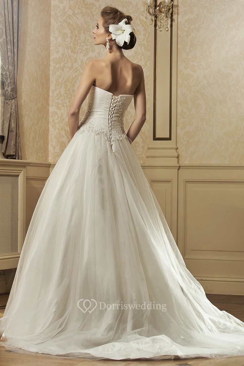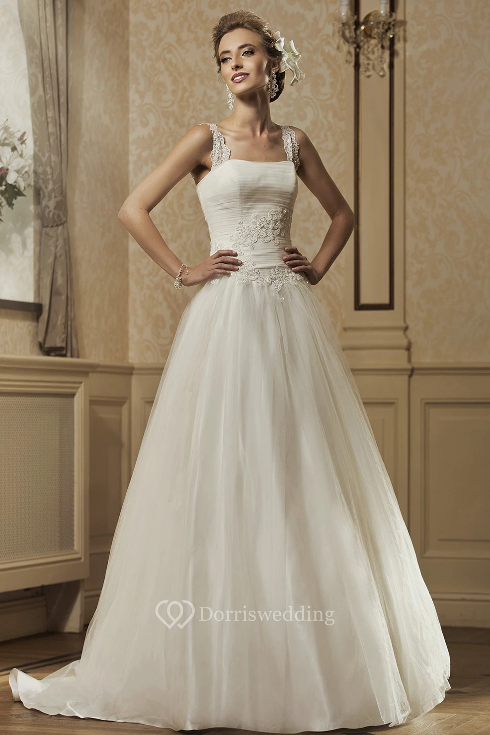 A-Line Strapped Sleeveless Floor-Length Ruched Tulle&Satin Wedding Dress With Appliques