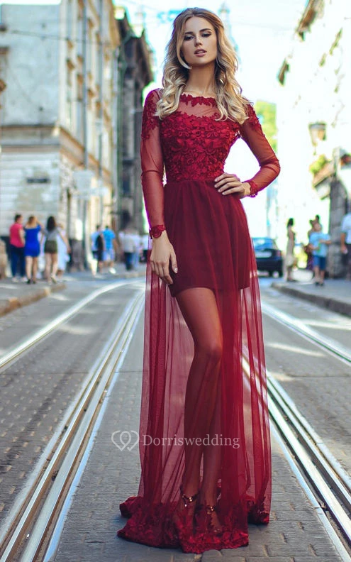 A-Line Sweep Bateau Long Sleeve Tulle Appliques Pleats Zipper Dress