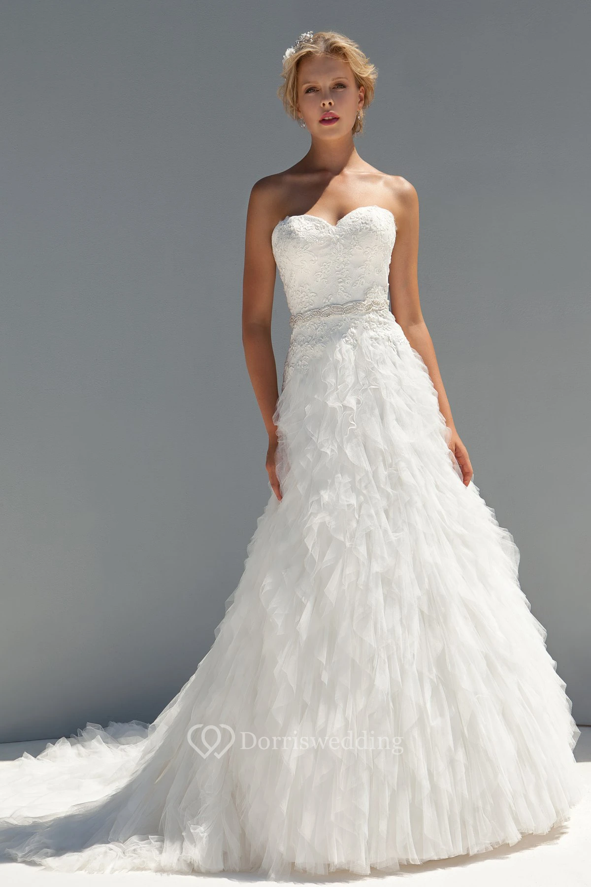 A-Line Sweetheart Floor-Length Cascading-Ruffle Sleeveless Tulle Wedding Dress With Appliques And Waist Jewellery