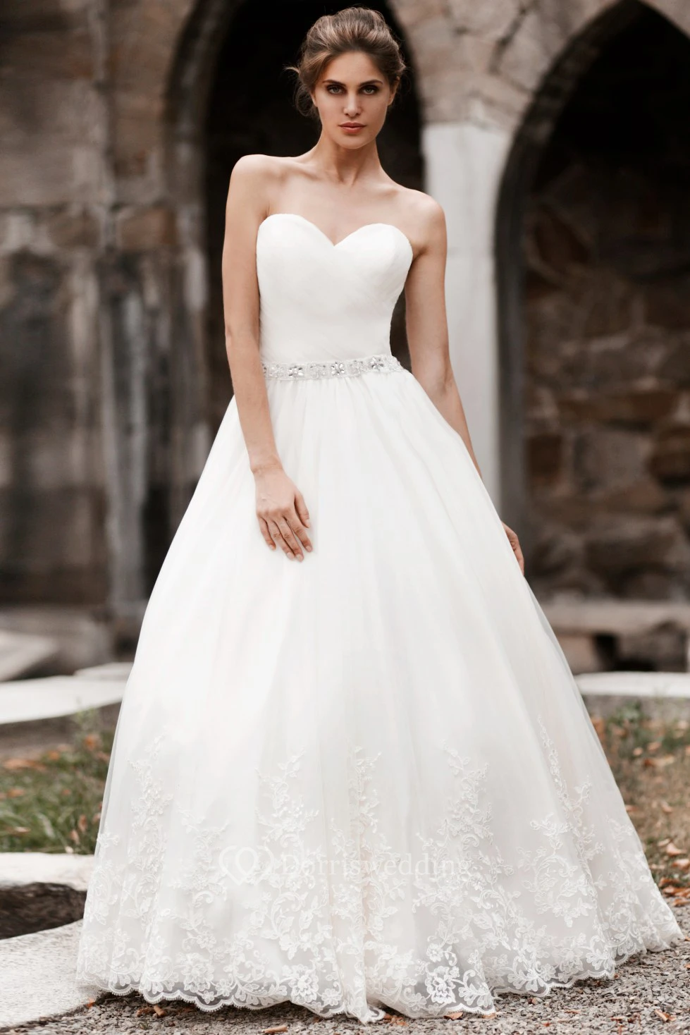 A-Line Sweetheart Floor-Length Criss-Cross Sleeveless Lace&Tulle Wedding Dress With Waist Jewellery And Appliques