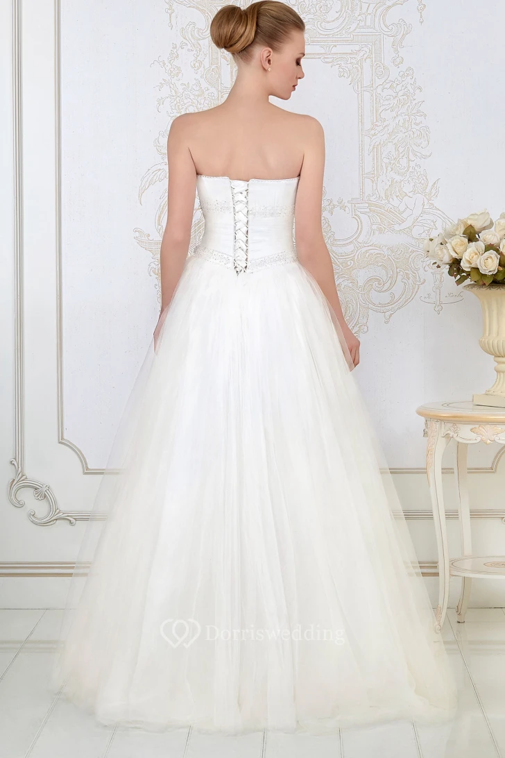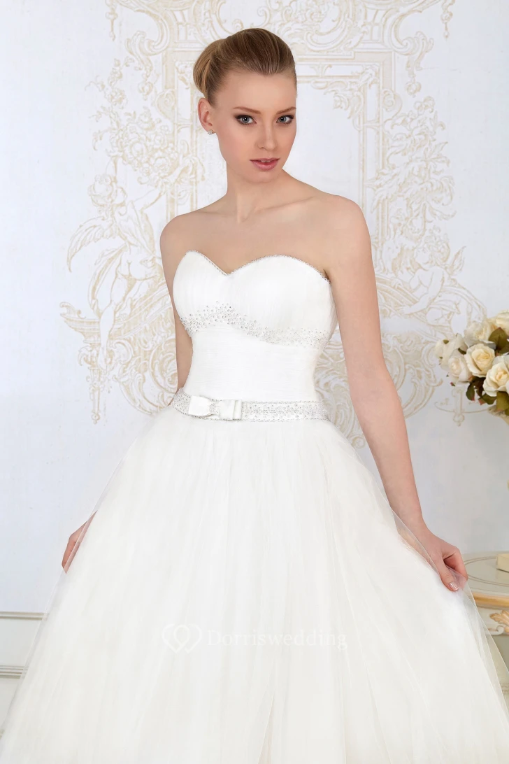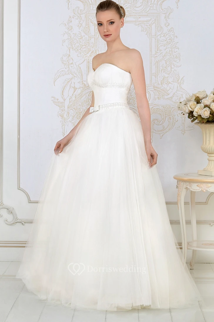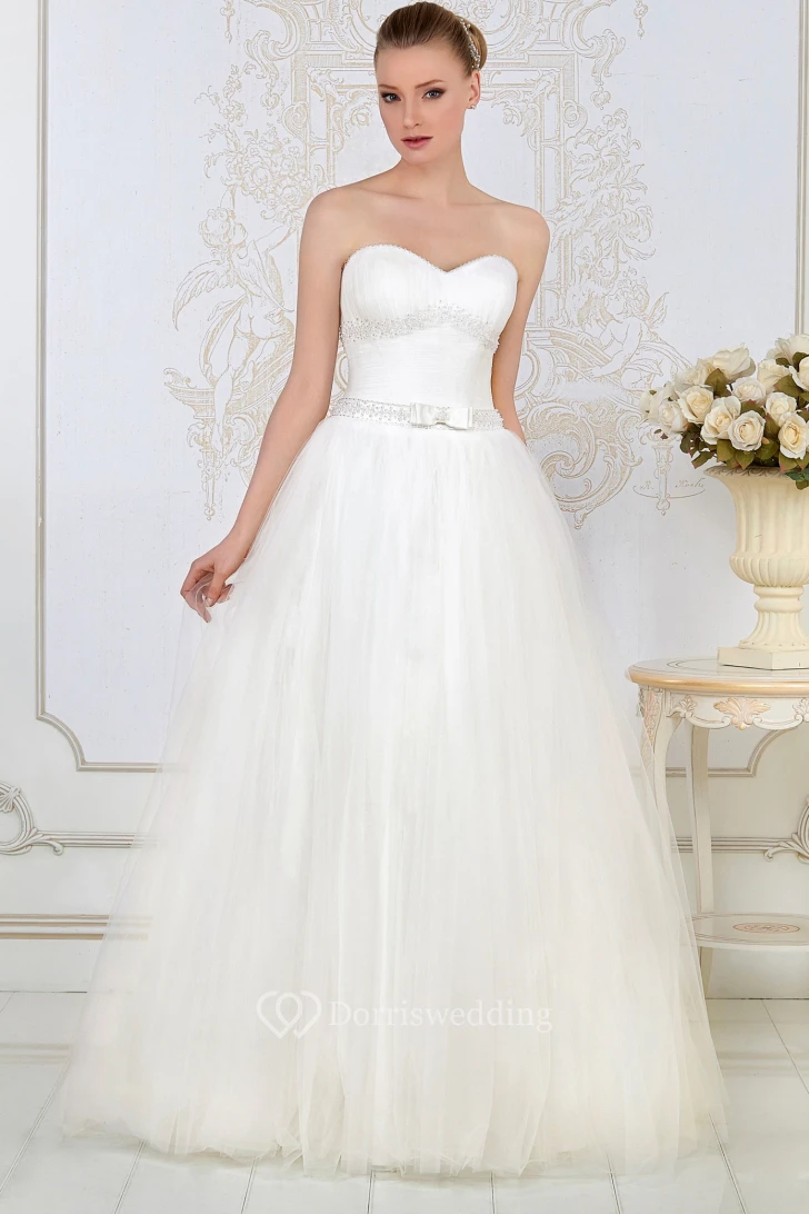 A-Line Sweetheart Floor-Length Ruched Sleeveless Tulle Wedding Dress With Beading And Bow