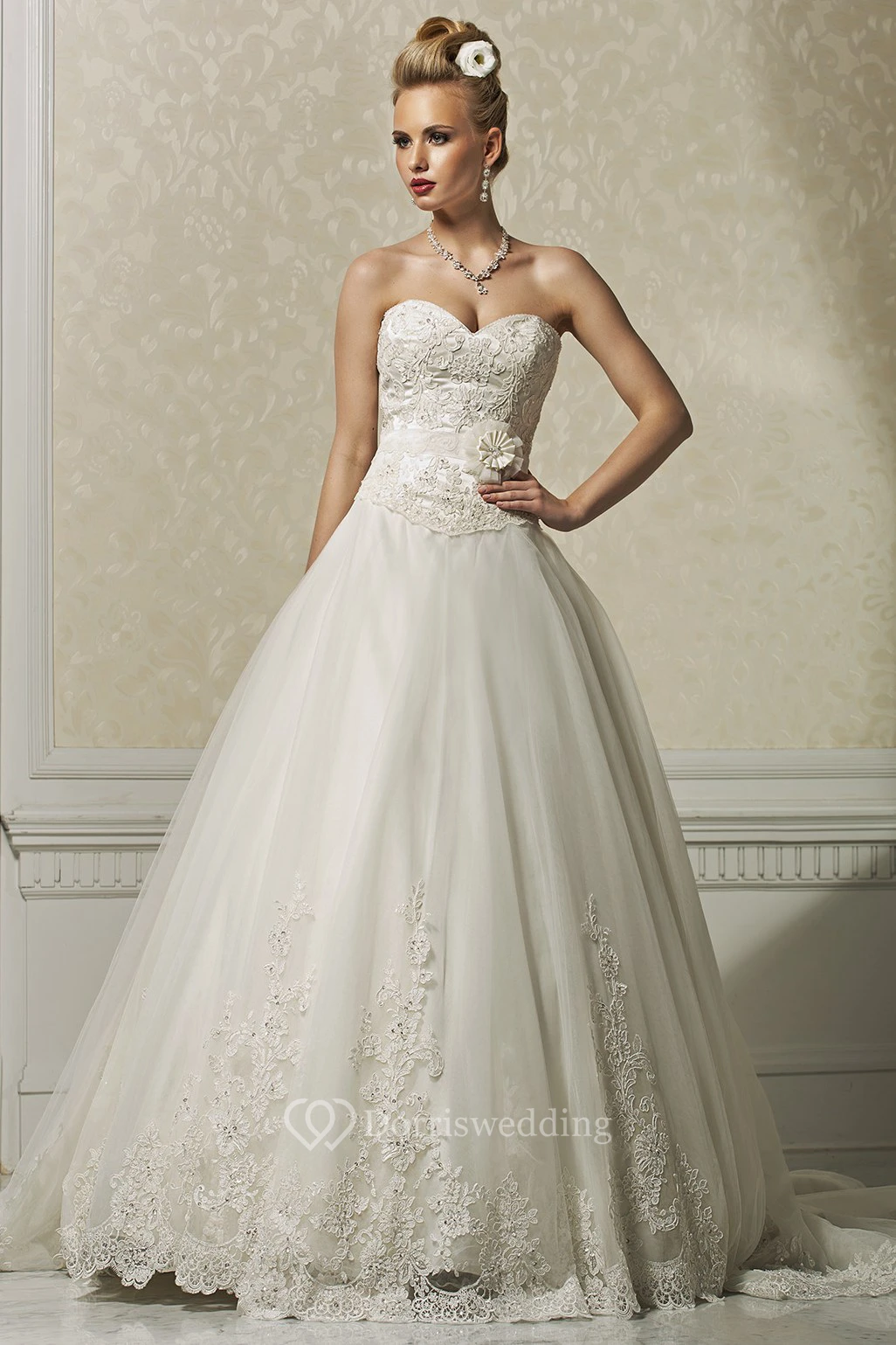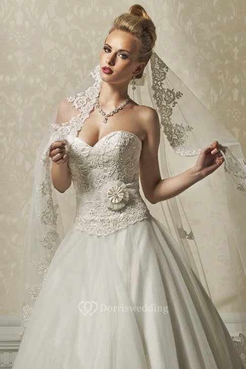 A-Line Sweetheart Floor-Length Sleeveless Appliqued Lace&Tulle Wedding Dress With Flower
