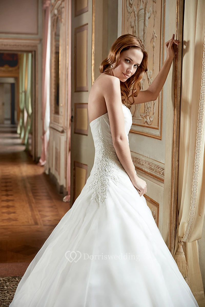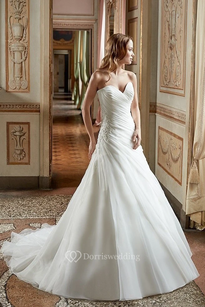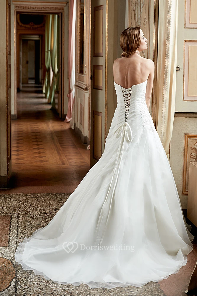 A-Line Sweetheart Long Appliqued Tulle Wedding Dress With Ruching And Corset Back