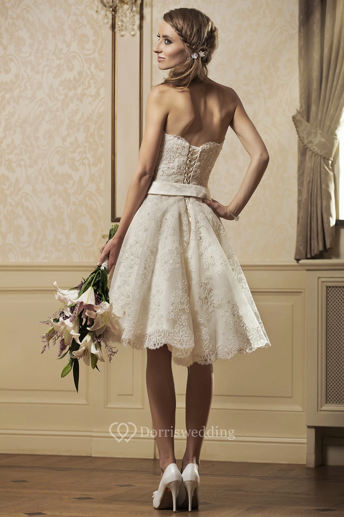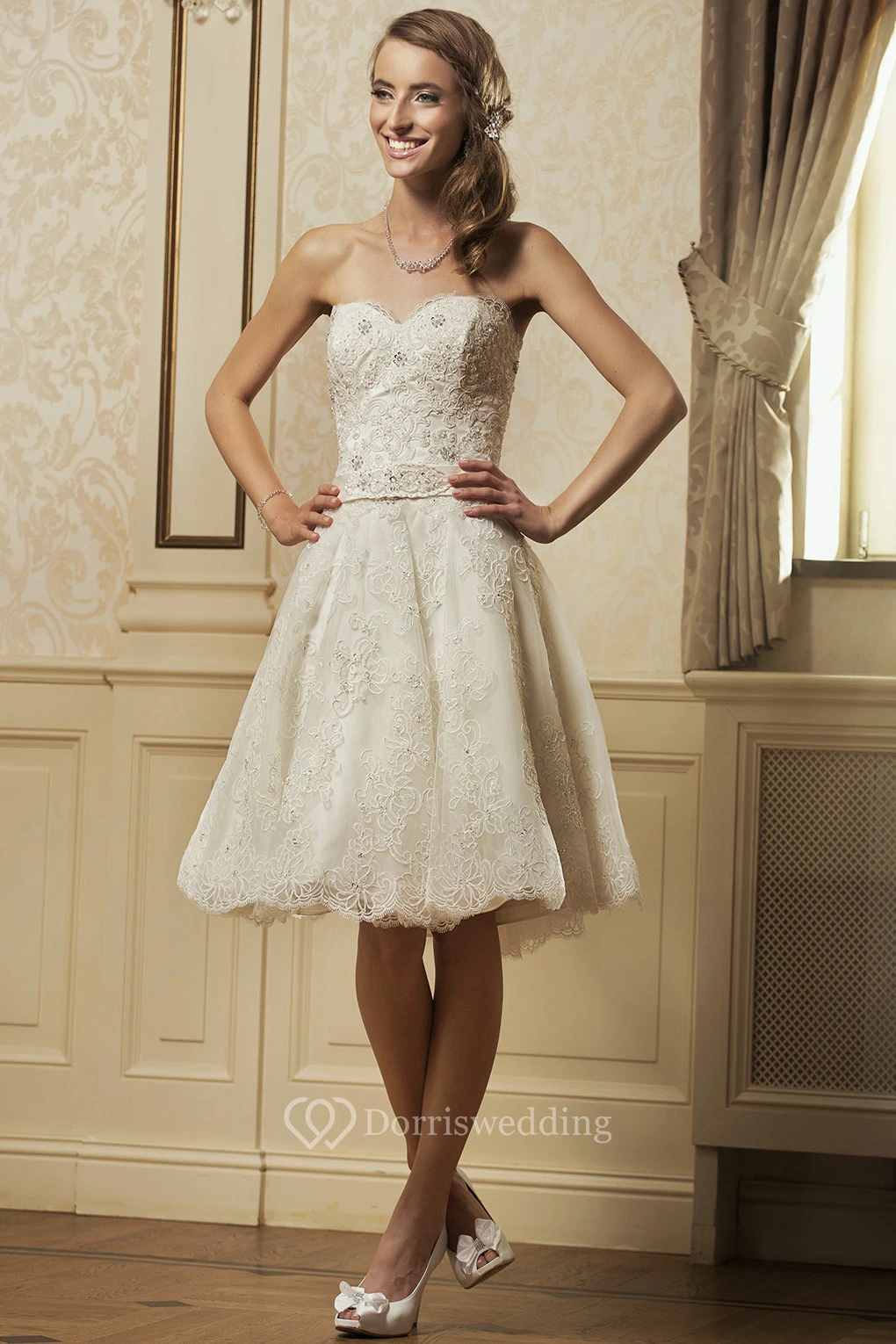 A Line Sweetheart Short Mini Appliqued Sleeveless Lace Wedding Dress