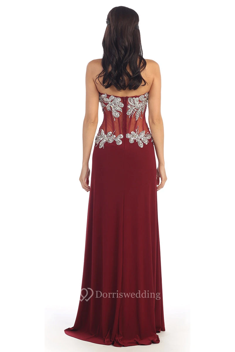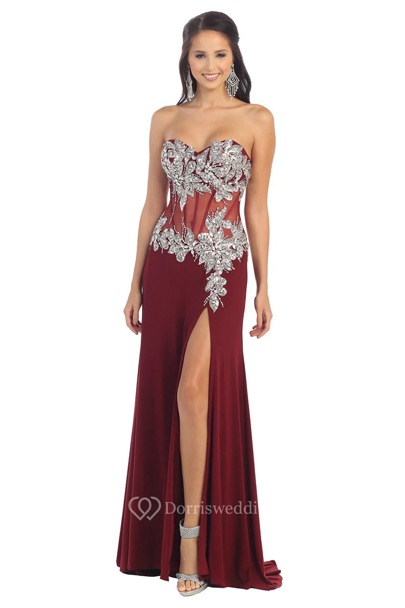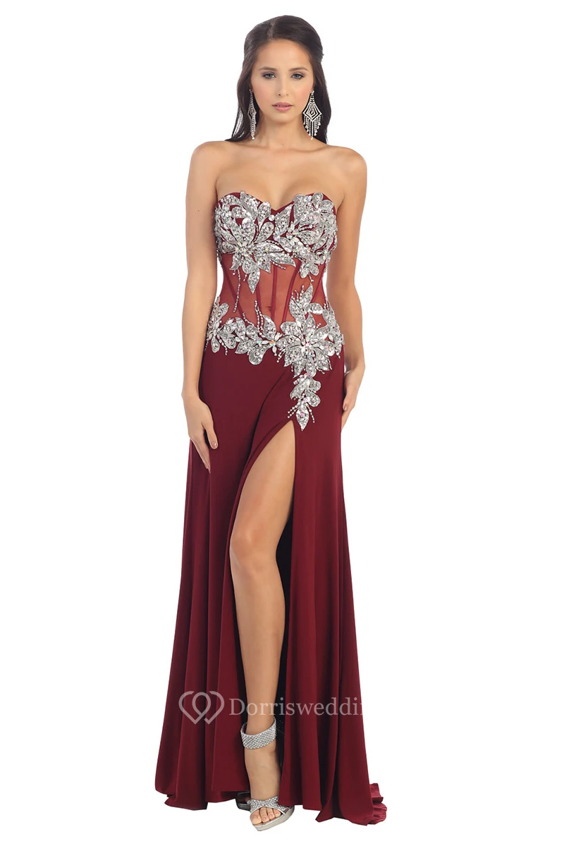 A-Line Sweetheart Sleeveless Jersey Illusion Dress With Split Front And Beading