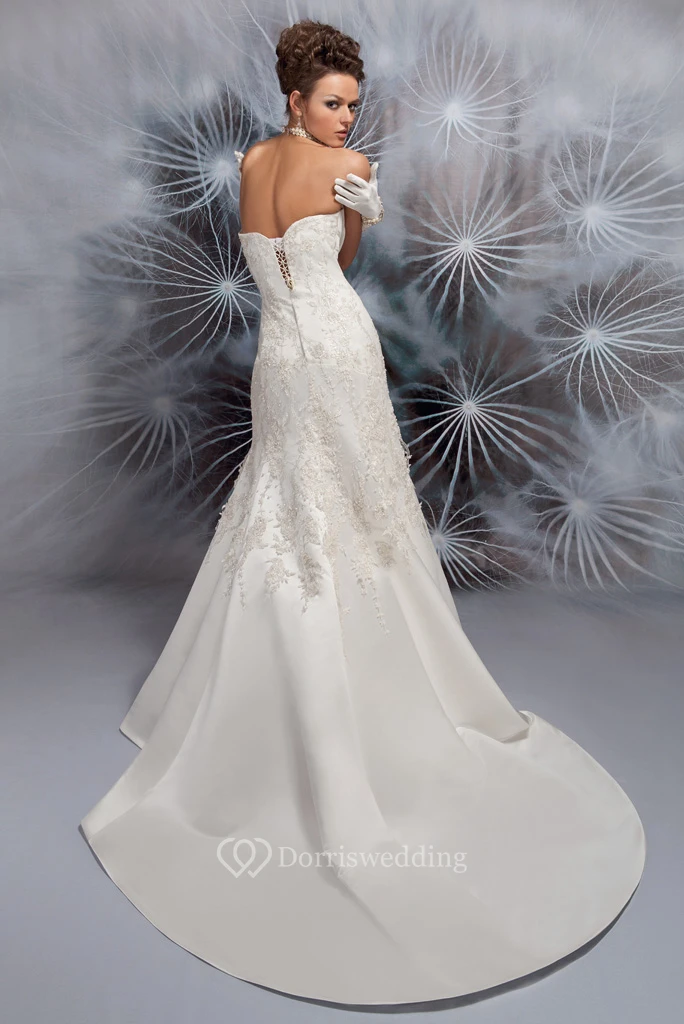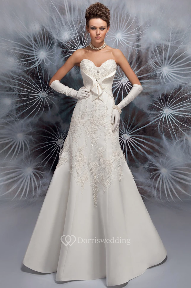 A-Line Sweetheart Sleeveless Long Appliqued Satin Wedding Dress With Corset Back And Watteau Train