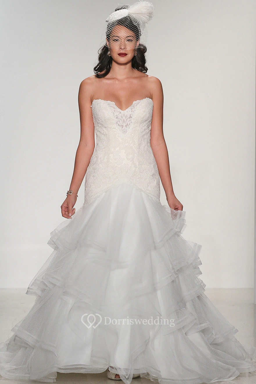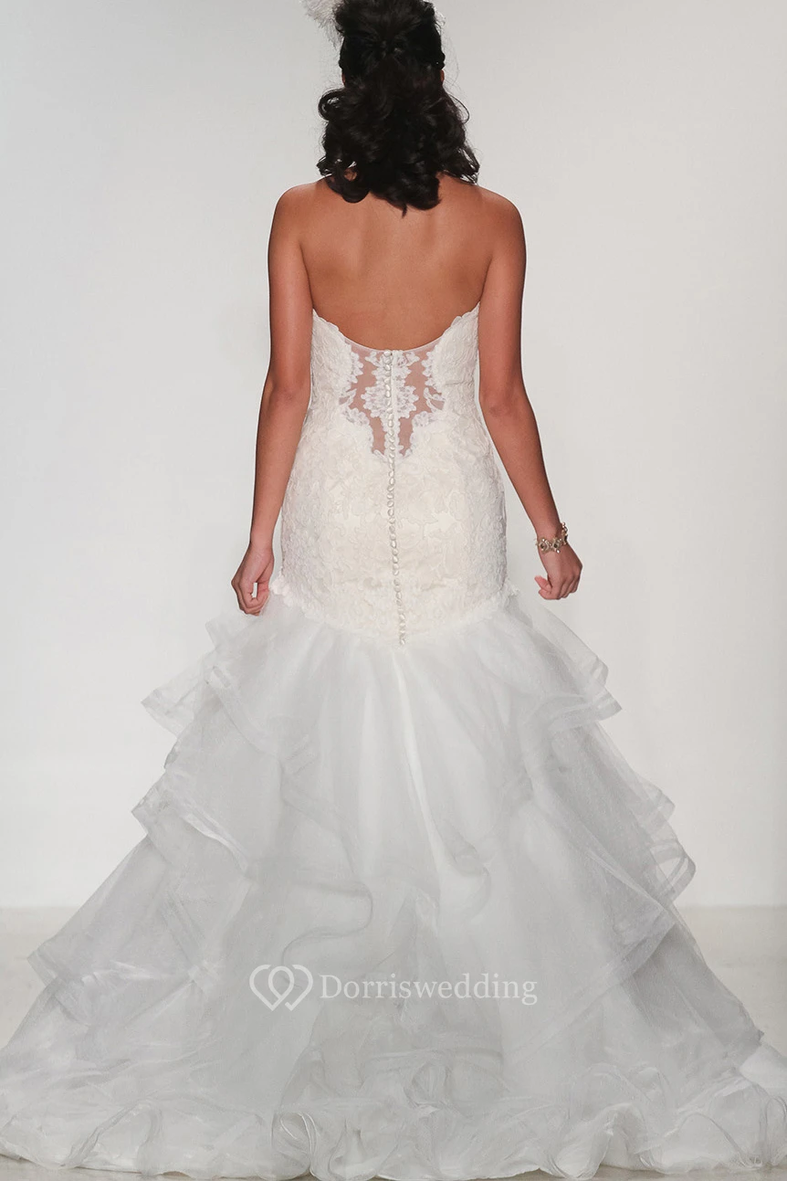 A-Line Sweetheart Tiered Floor-Length Organza&Lace Wedding Dress With Appliques And Deep-V Back