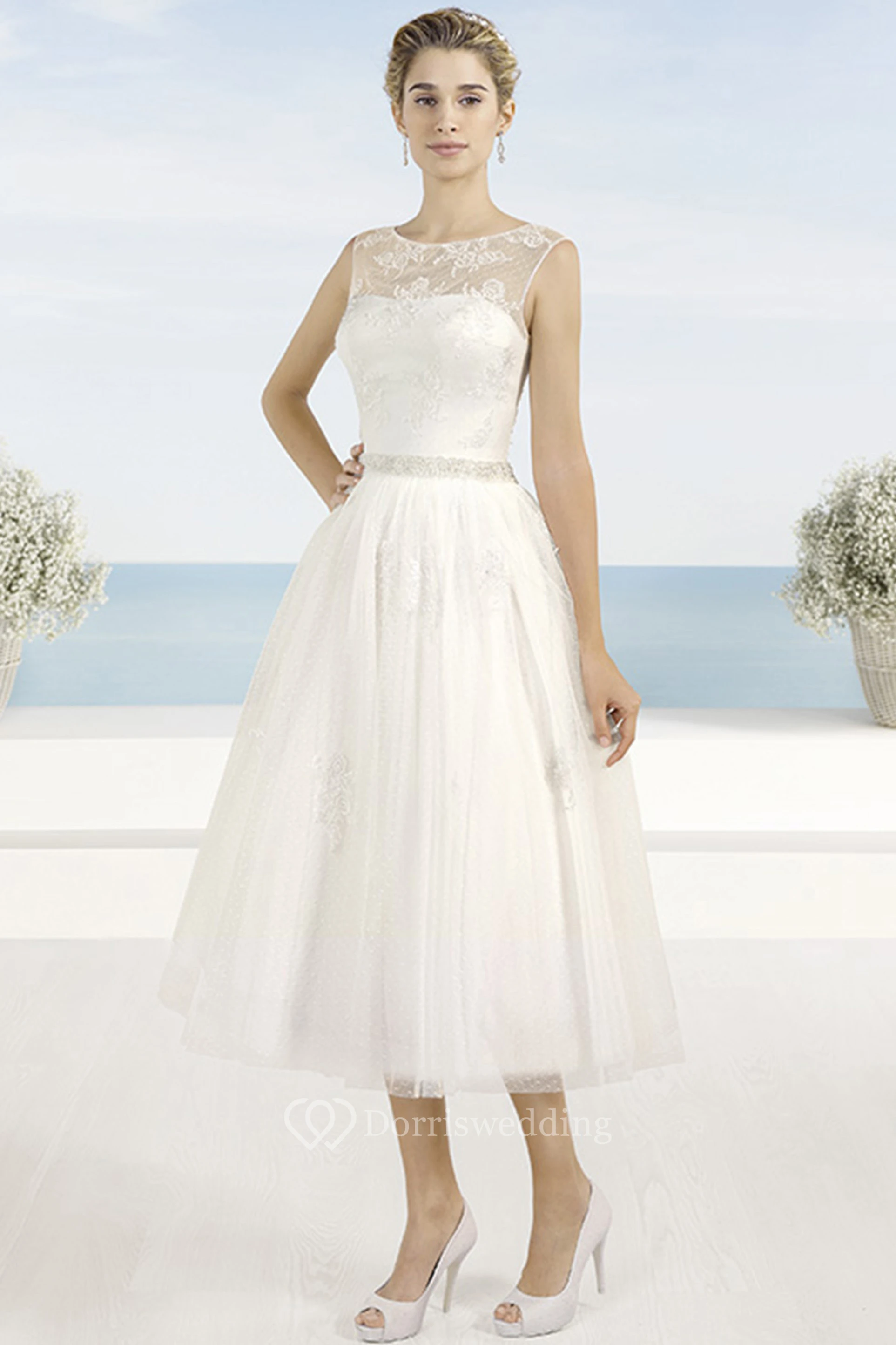 A-Line Tea-Length Appliqued Scoop Neck Sleeveless Tulle Short Wedding Dress