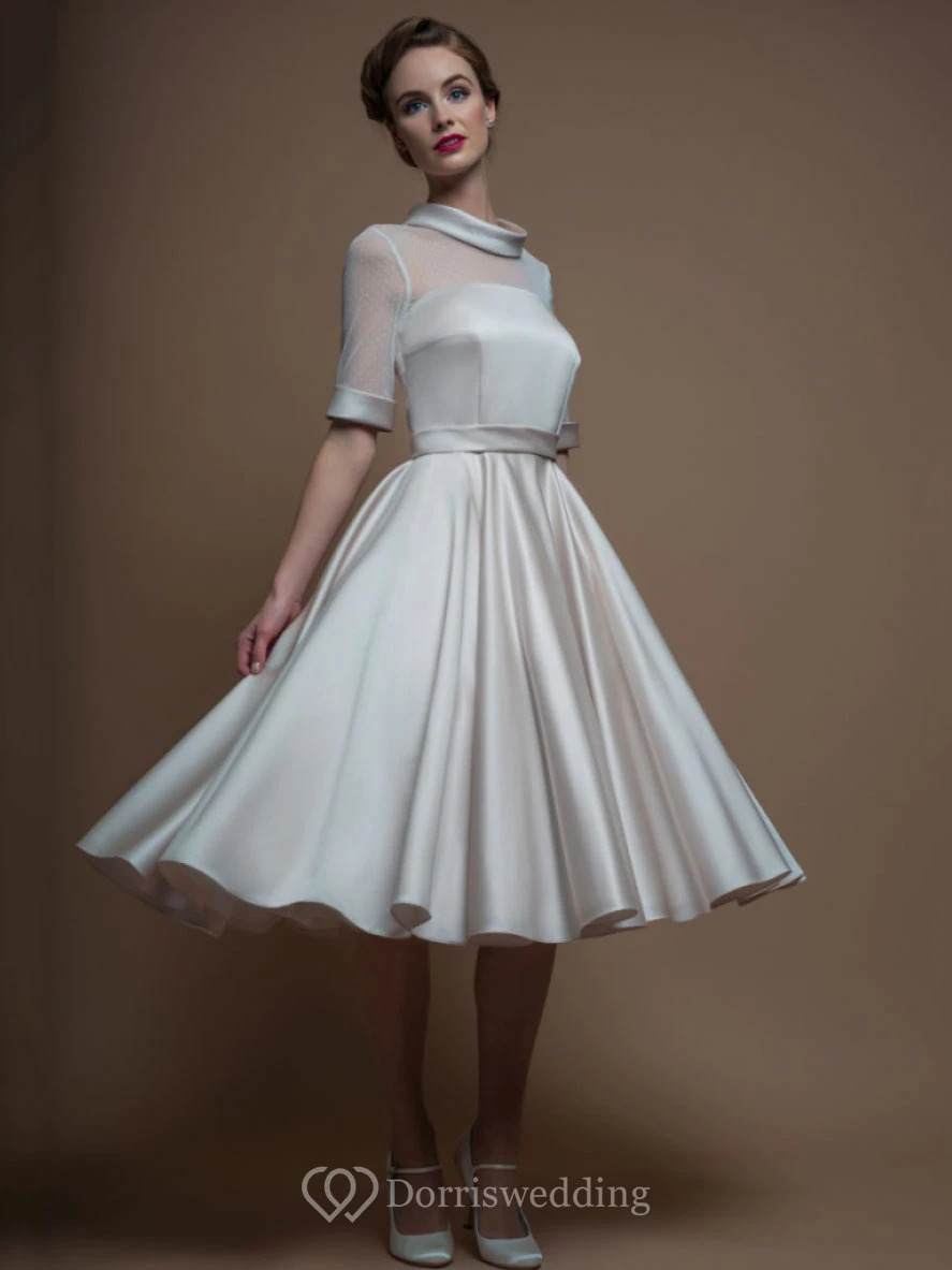 A-Line Tea-Length High Neck Sleeveless Satin Wedding Dress With Illusion