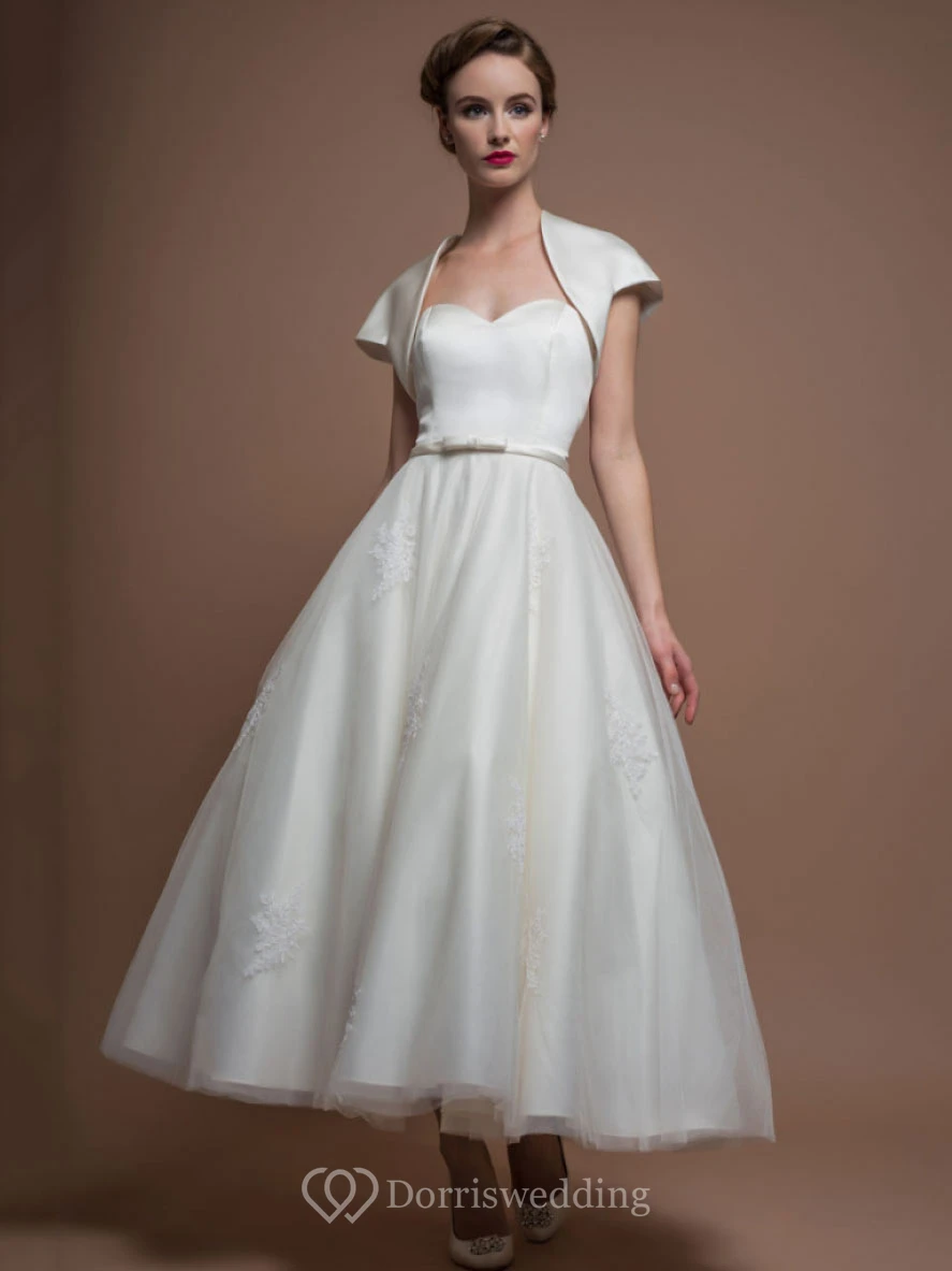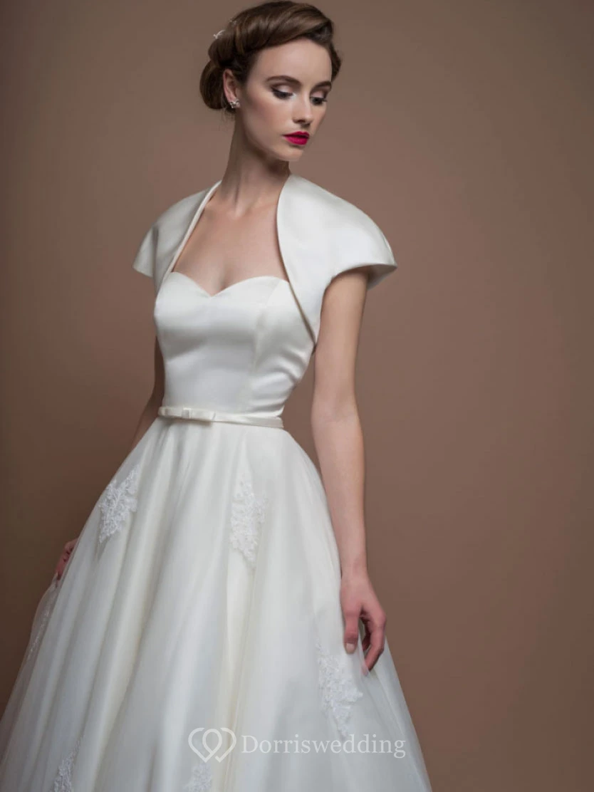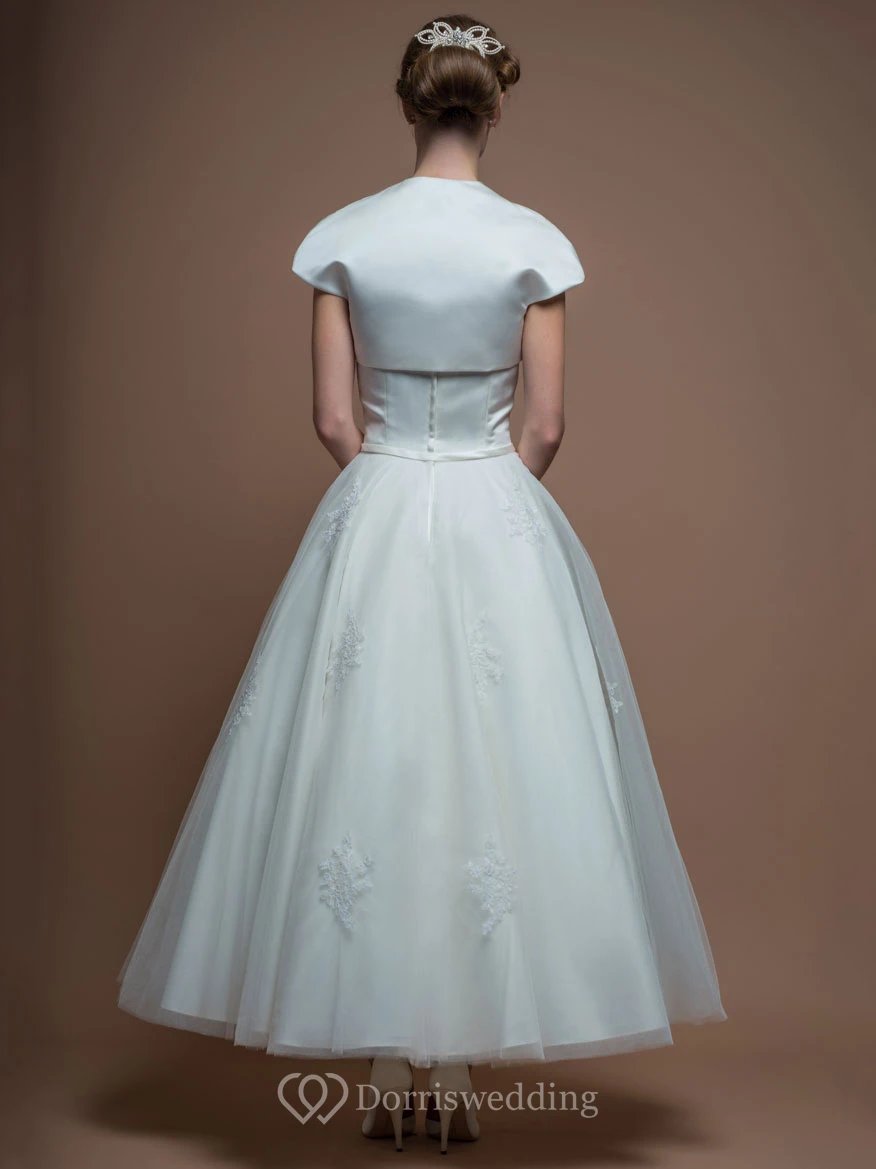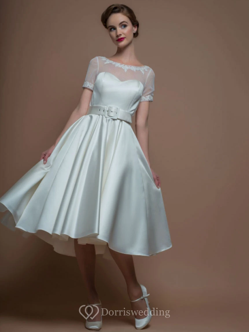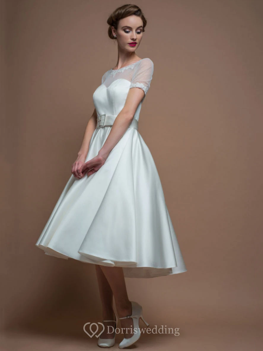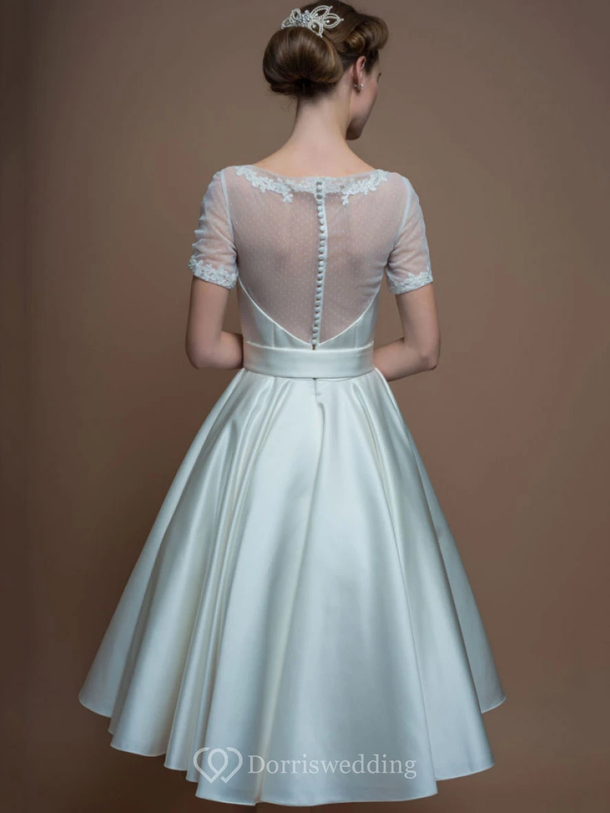 A-Line Tea-Length Short-Sleeve Scoop-Neck Satin Wedding Dress With Illusion