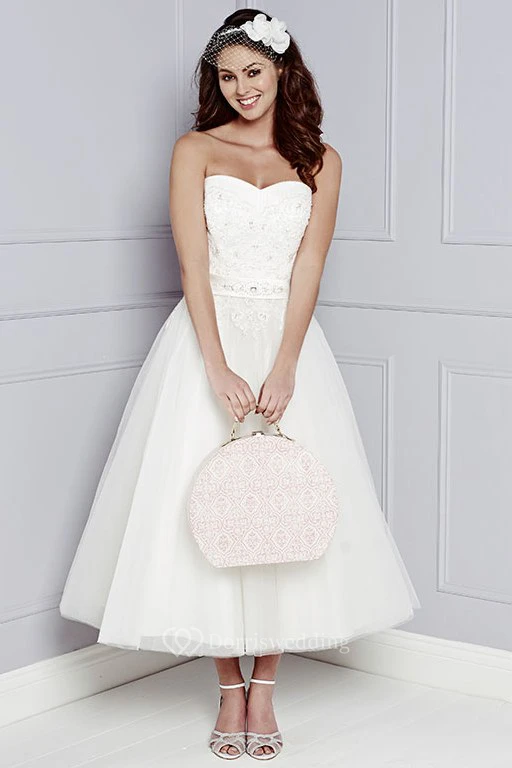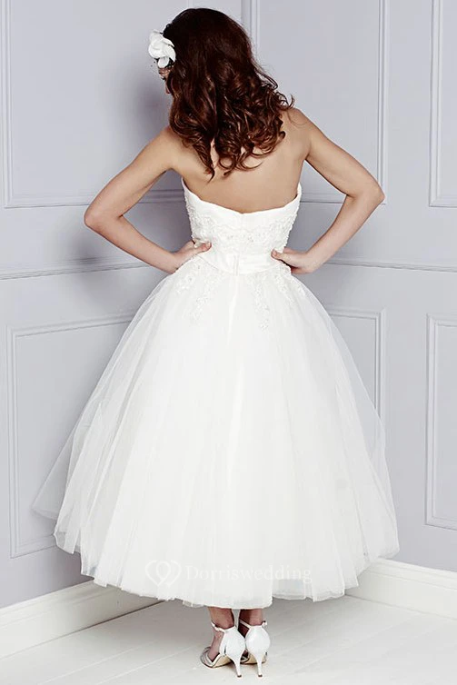 A-Line Tea-Length Sleeveless Strapless Appliqued Tulle Wedding Dress With Waist Jewellery