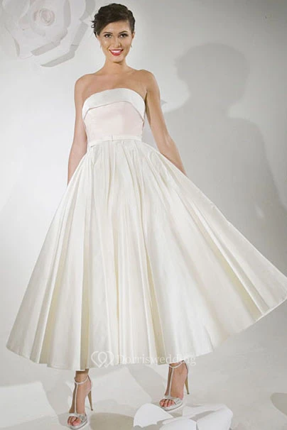 A-Line Tea-Length Strapless Satin Wedding Dress With V Back
